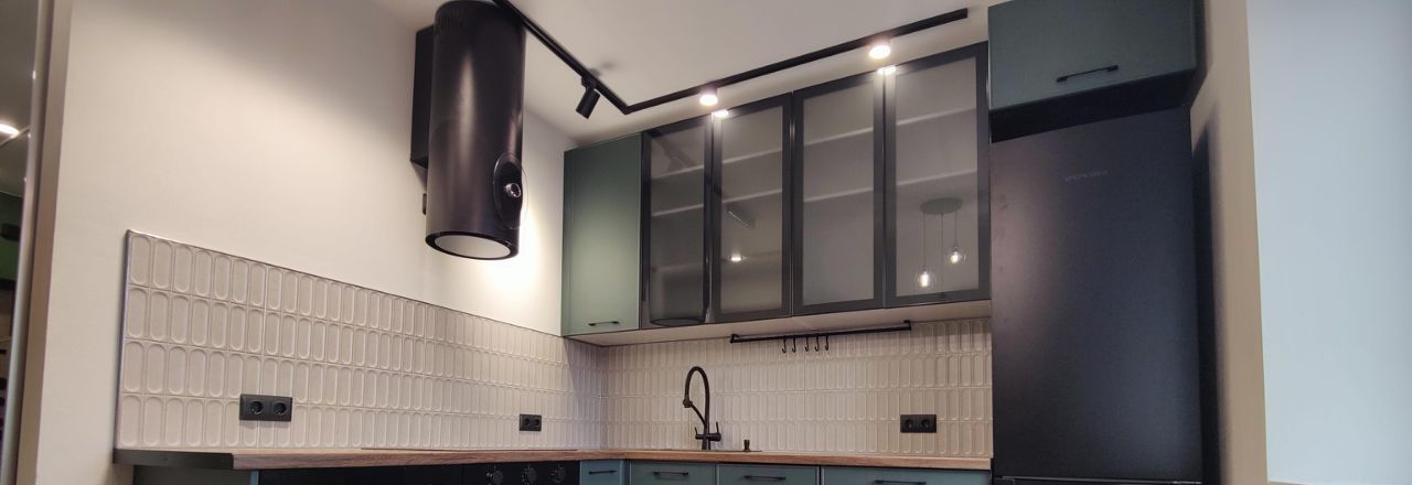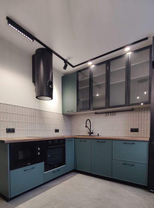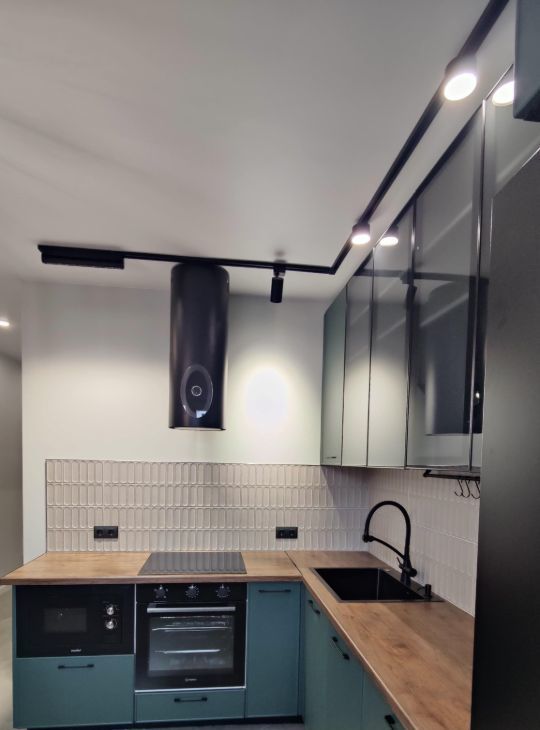 На кухне функциональный кухонный гарнитур, включающий в себя посудомоечную машину, встроенный духовой шкаф, встроенная варочная поверхность, встроенная СВЧ, холодильник, фильтр для воды, кухонный стол + стулья. Пару сценариев освещения для создания уютной атмосферы.