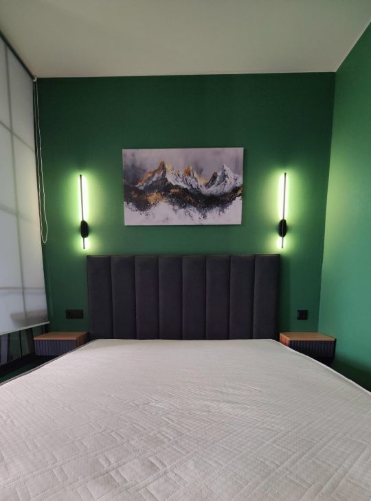 В гостиной сделано зонирование на спальную и бытовую зону отдыха. Из мебели имеется двухспальная кровать с отличным матрасом, две прикраватные тумбочки, раскладной диван, небольшое рабочее место и вместительный комод. Также в гостиной присутствует кондиционер и выход на лоджию.