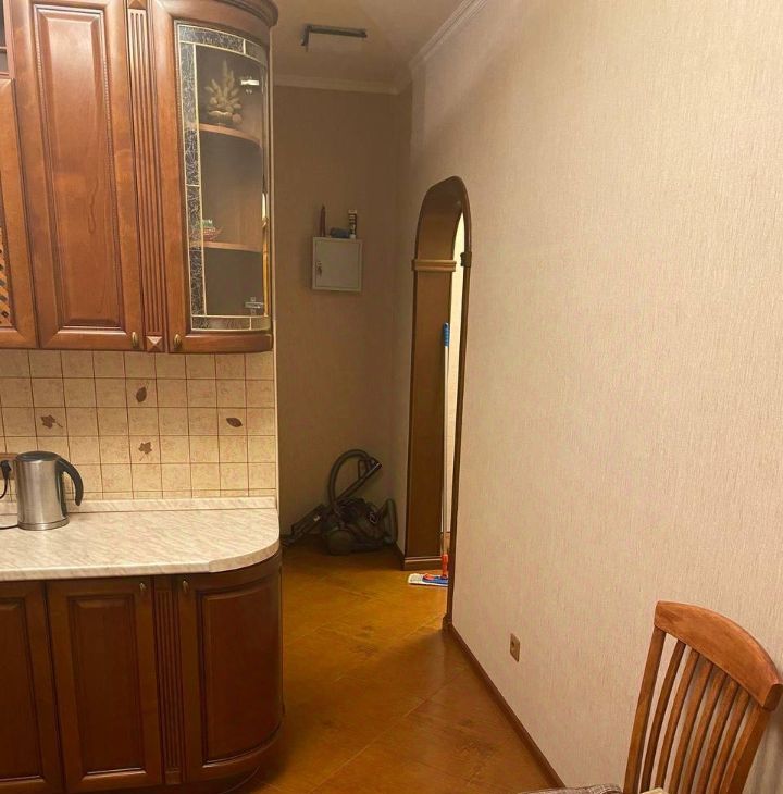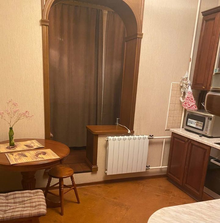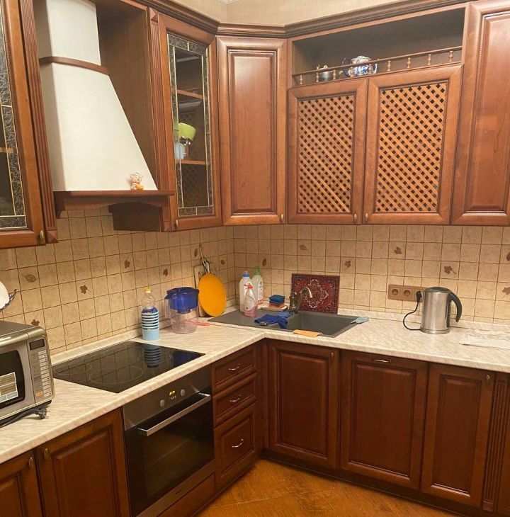 Квартира полностью укомплектована всей необходимой мебелью и бытовой техникой. На кухне встроен кухонный гарнитур из массива дерева с посудомоечной машиной Bosh, варочная панель Electrolux и духовой шкаф, микроволновая печь и чайник. На утепленной лоджии стоит холодильник.