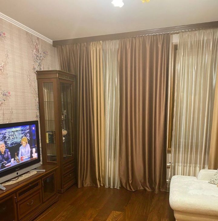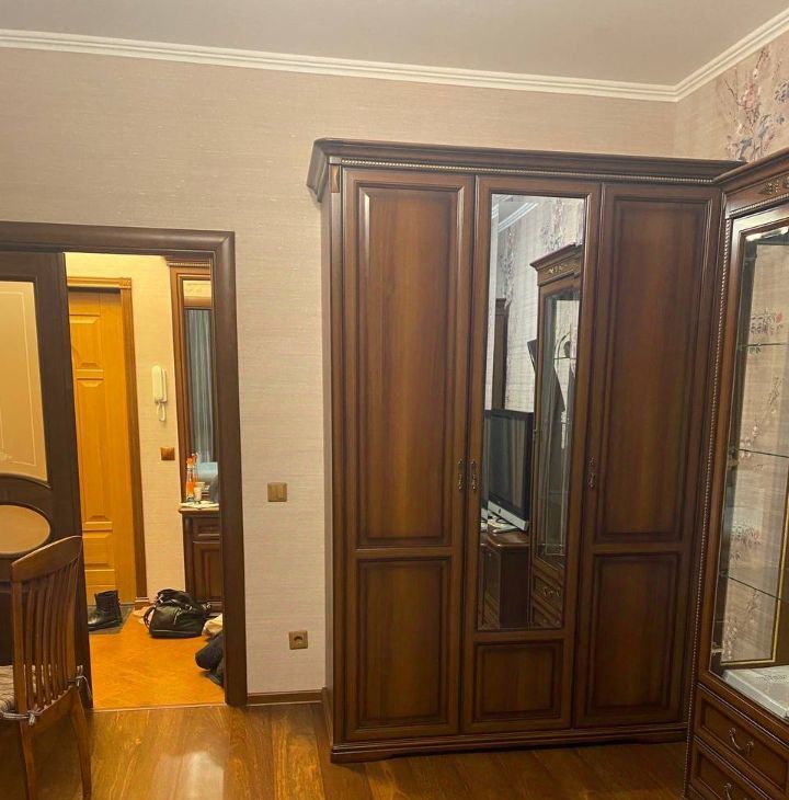 В жилой комнате стоит белый раскладывающийся диван, шкаф из массива дерева для хранения одежды, письменный стол, комод под телевизор и телевизор. Также в квартире есть вентилятор Dyson и пылесос Dyson, в прихожей зеркало и тумба.