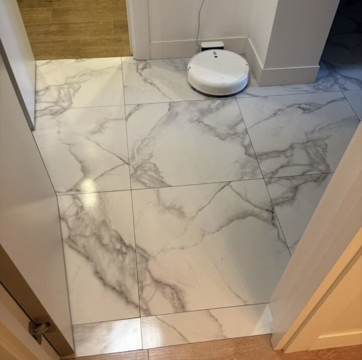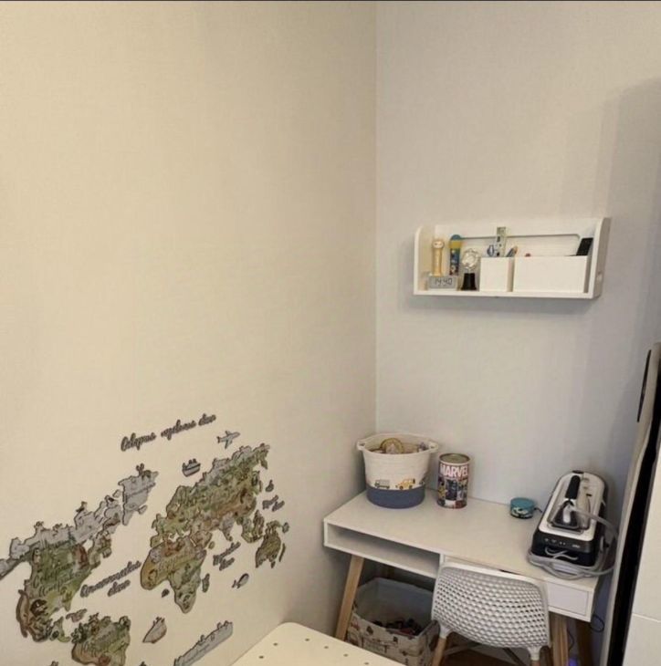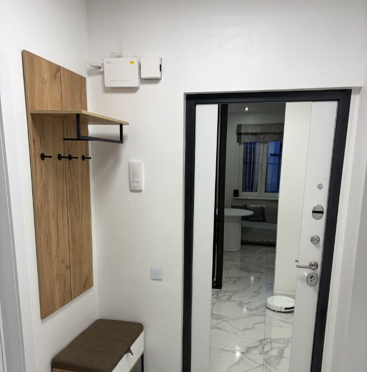 - Полы: ровные, без порогов (идеально для робота-пылесоса). В коридоре, кухне и ванной — керамогранит, в комнате — ламинат.