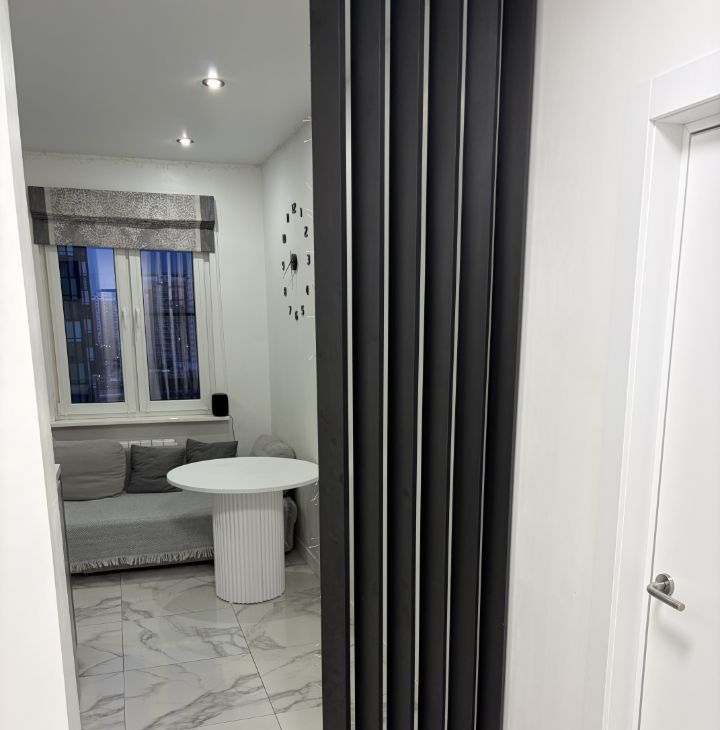 Квартира светлая, зона коридора отделена от кухни стильной реечной перегородкой.