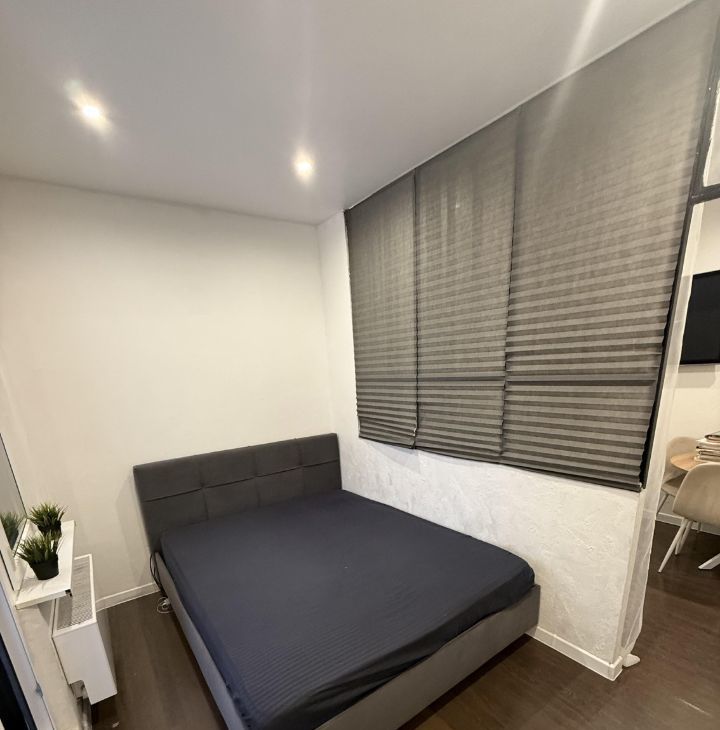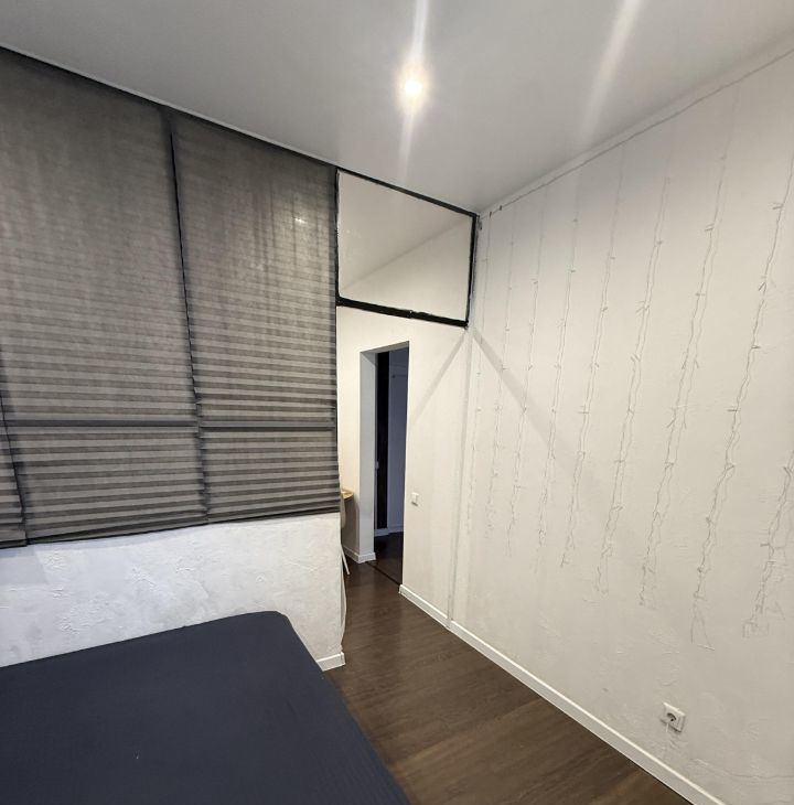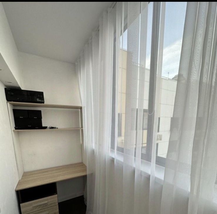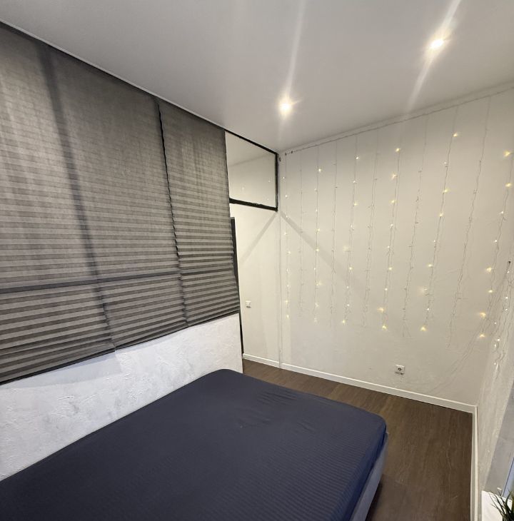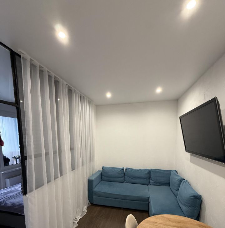 Зонирование: стеклянная перегородка с чёрным профилем, комната разделена на: спальня + гостиная, как в двухкомнатной квартире Балкон-кабинет с подогревом пола (электричество), розетки по всему периметру, утепление, натяжные потолки с точечными светильниками - идеальное рабочее место для удаленки