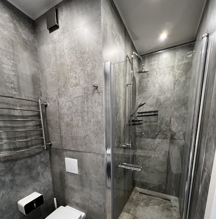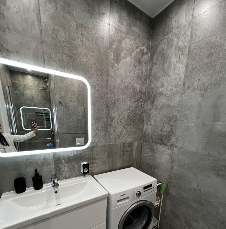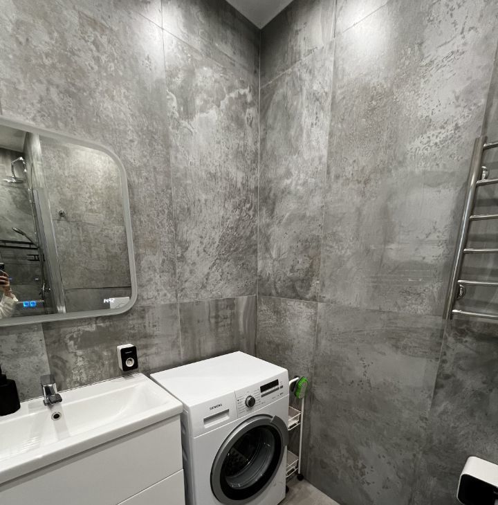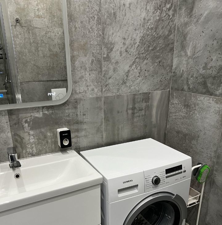 Кухня оборудована встроенной техникой: холодильник, морозилка (на 3 ящика), посудомоечная машина, электрическая плита, духовой шкаф, вытяжка. Есть стиральная машина.