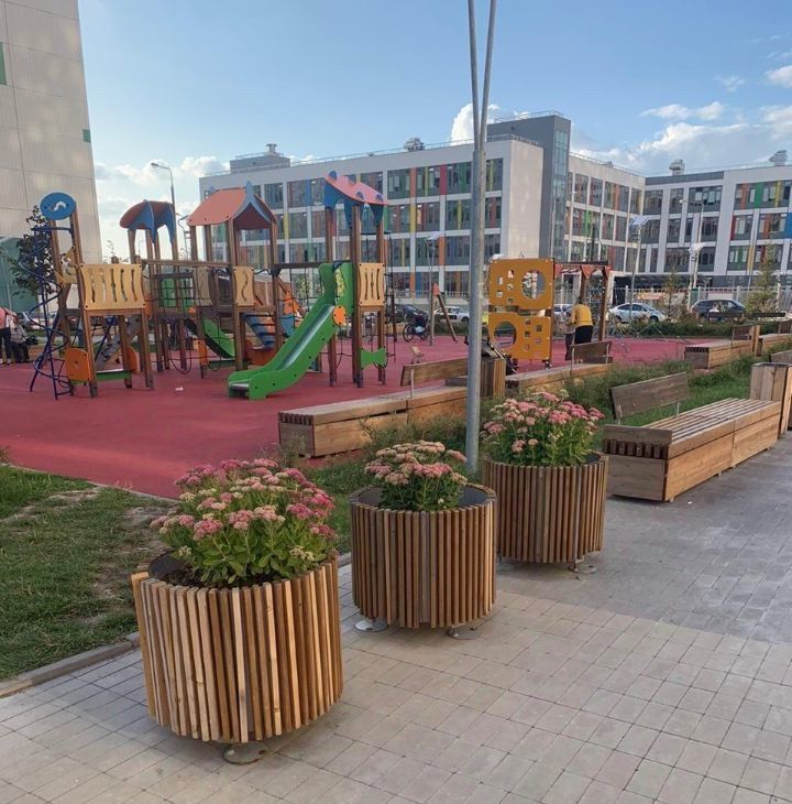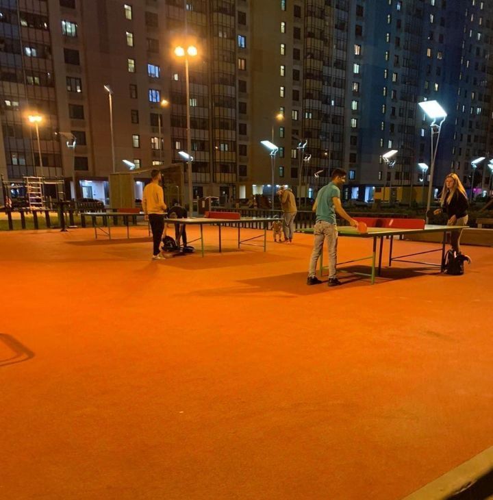 Двор благоустроен, детские площадки, спортивные снаряды, теннисные столы, площадка для волейбола и баскетбола, дорожки для бега.