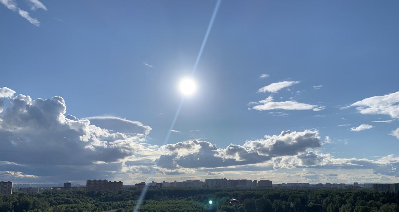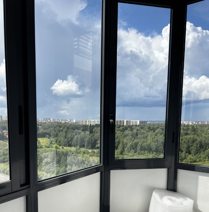 Балкон застекленный с потрясающим видом на закат, парк и пруды, 15 этаж, домов напротив нет, окна в окна не смотрят. Машин не слышно совсем, только чаек)