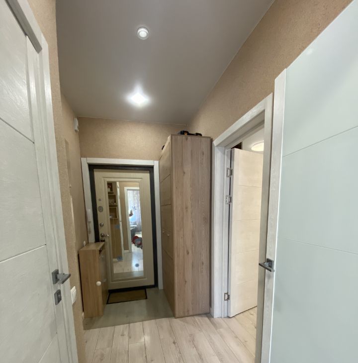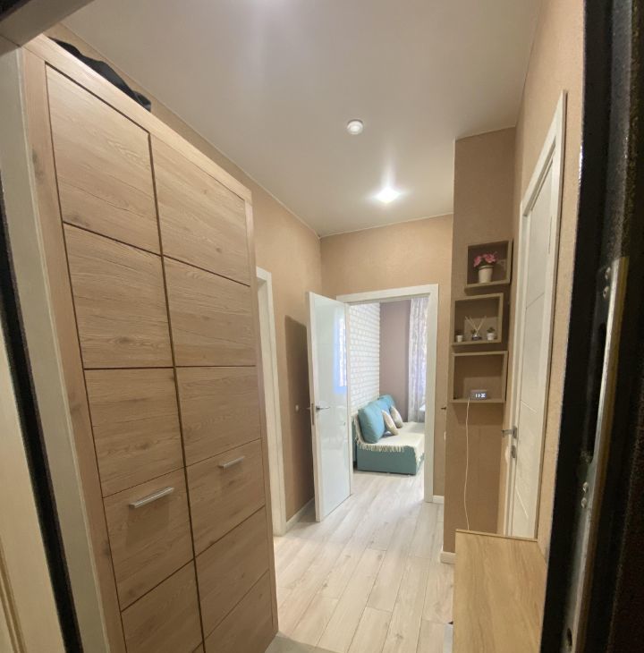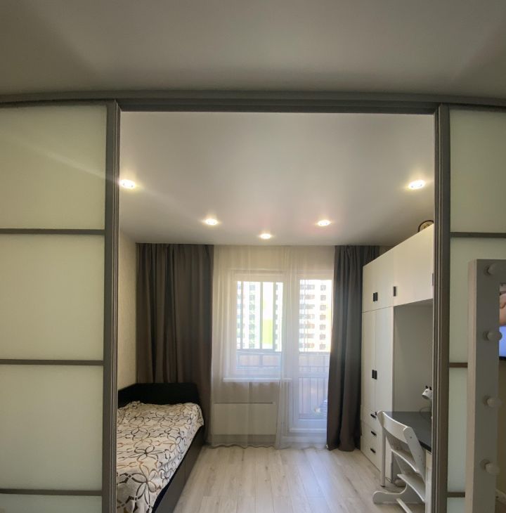 Выполнен качественный ремонт, основная комната зонирована раздвижной перегородкой, имеется большой встроенный шкаф.