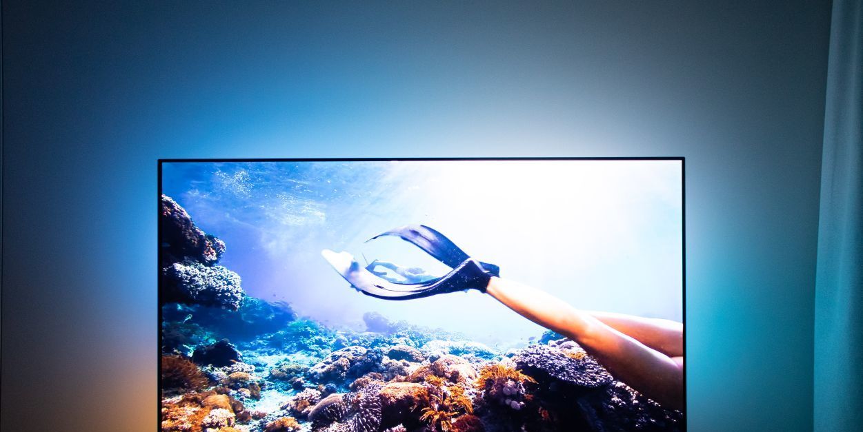 В гостиной - большой OLED-телевизор Philips с акустической системой Bowers & Wilkins и четырехсторонней подсветкой Ambilight