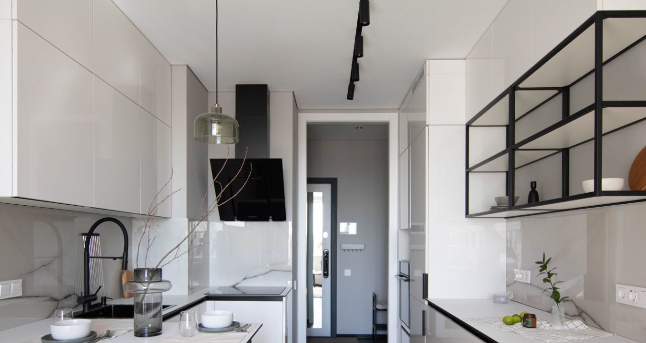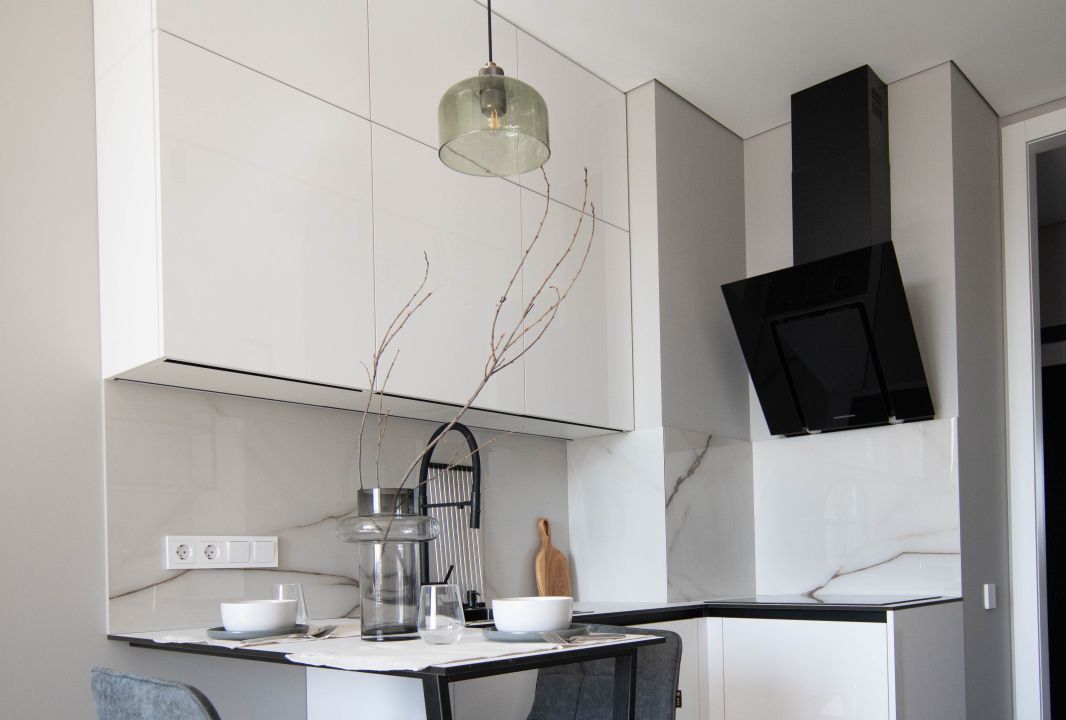 Качественная кухня с фасадами PerfectSense Premium, столешница — компакт-плита, фартук — керамогранит. Установлен фильтр для воды и измельчитель.