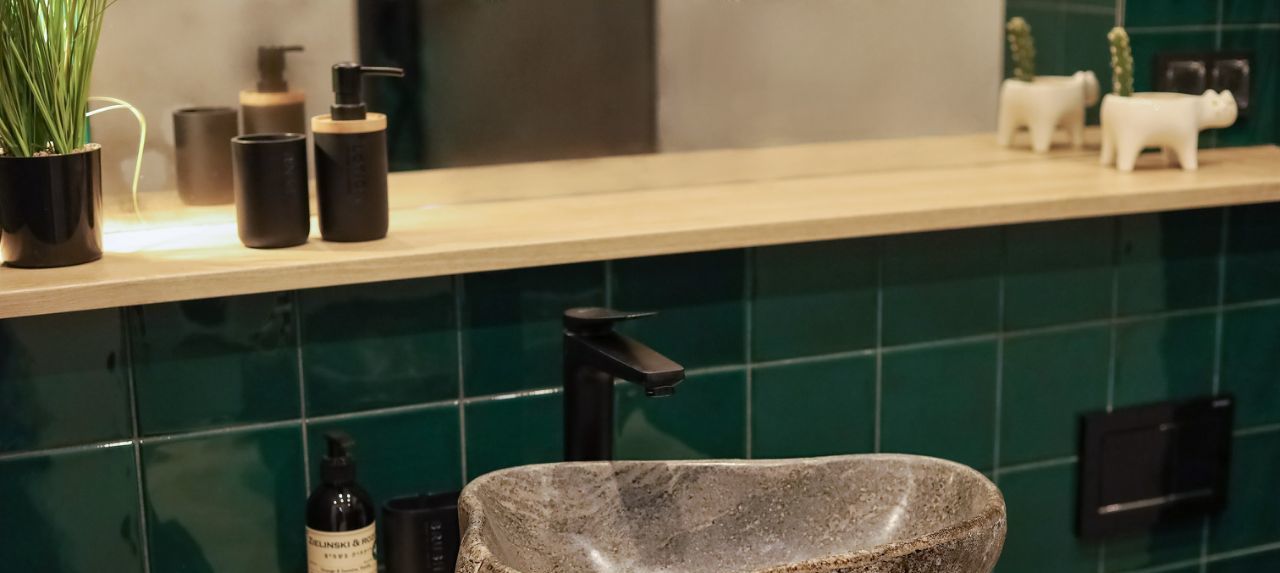 В санузле установлена раковина из камня.