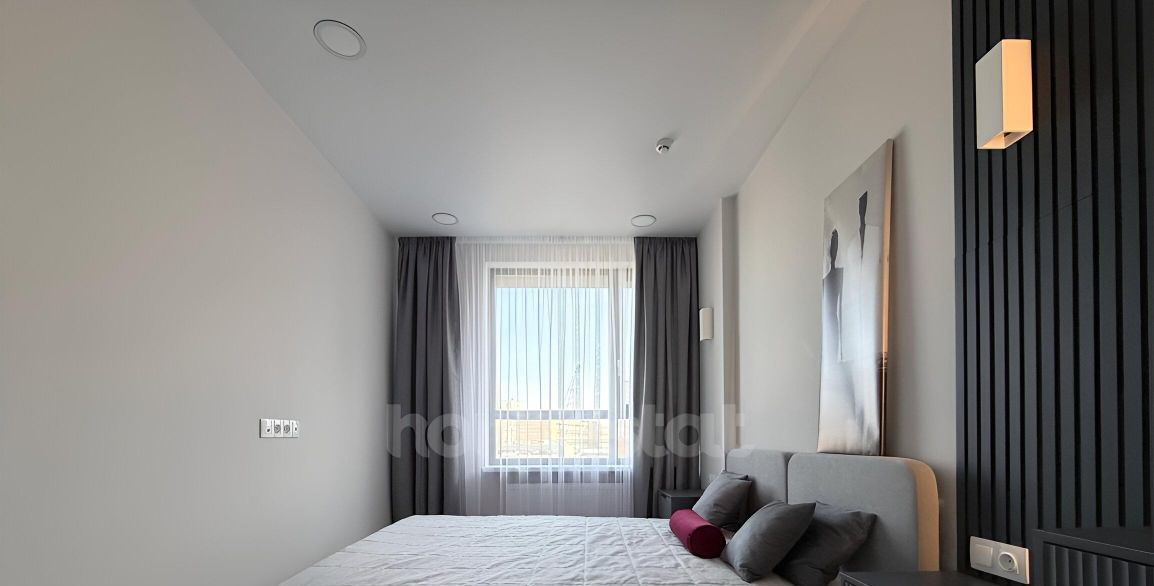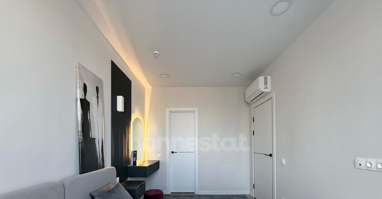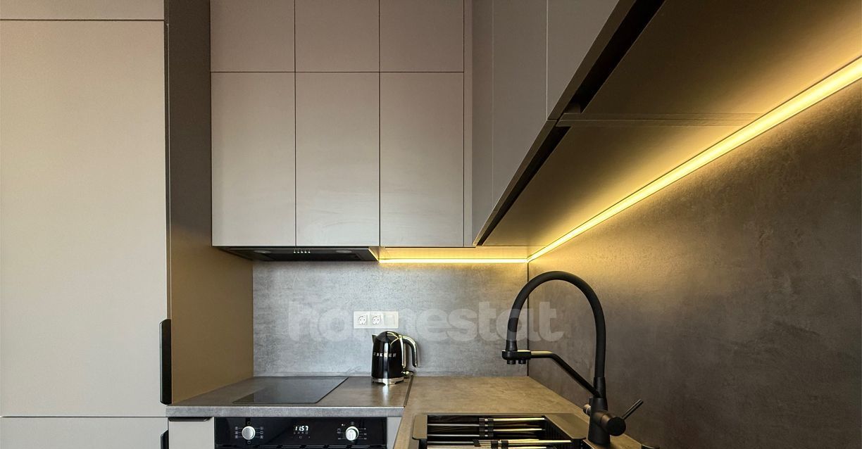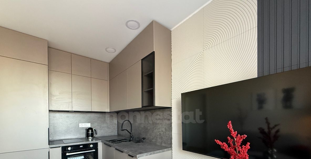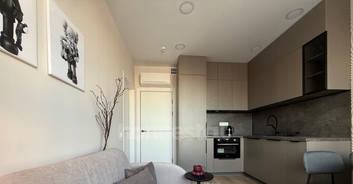 В квартире выполнен дизайнерский ремонт. Просторная жилая комната площадью 16 кв. м обставлена мебелью и оснащена всей необходимой техникой: кондиционером, телевизором, холодильником, посудомоечной и стиральной машинами. Кухня площадью 11 кв. м также меблирована. В совмещенном санузле установлена ванна. Окна выходят во двор, что обеспечивает тишину и уединение.