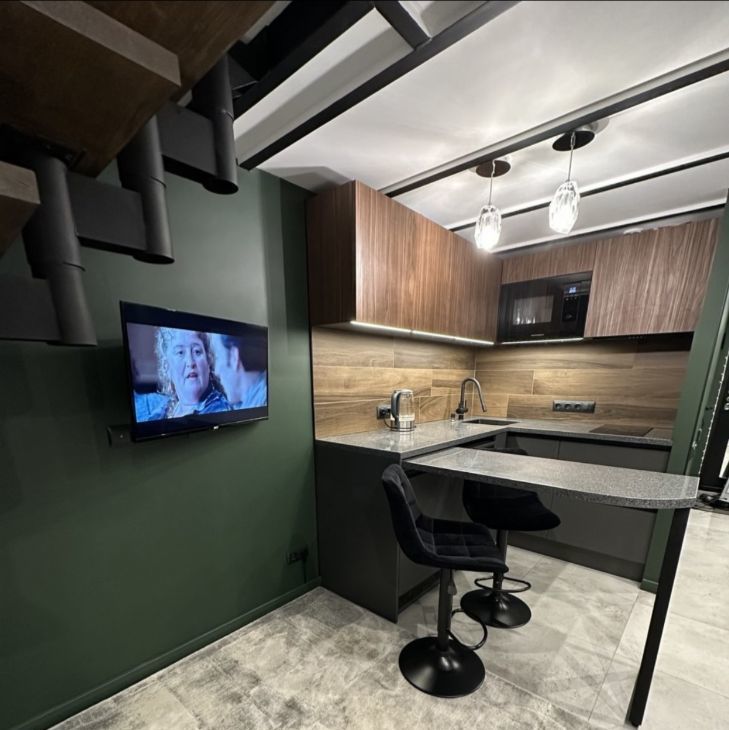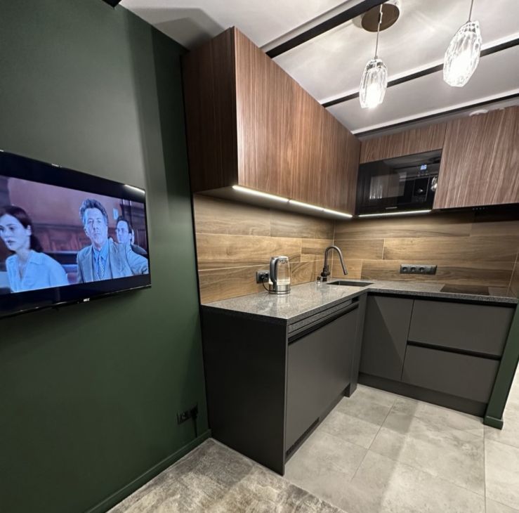 Из техники: встроены холодильник, варочная панель, вытяжка, посудомоечная машина, микроволновая печь + мини духовой шкаф.