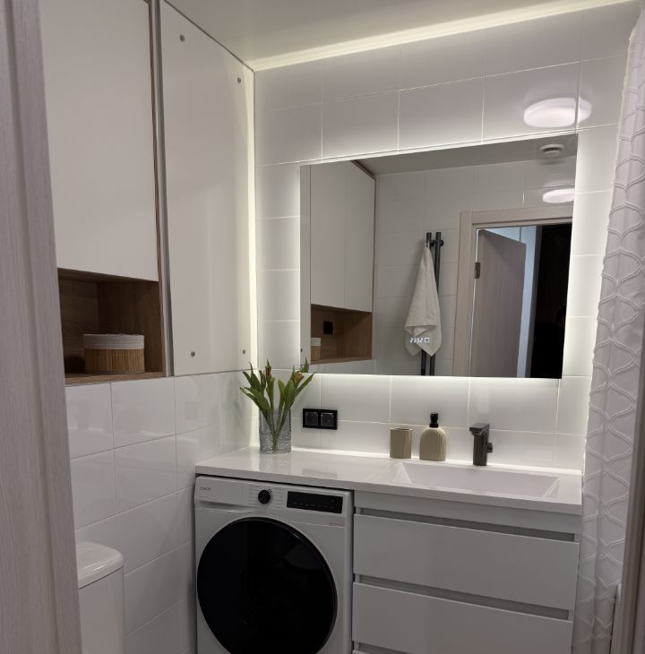 В ванной сенсорный кран с терморегулятором, стиральная машинка с функцией сушильной, электрический полотенцесушитель.