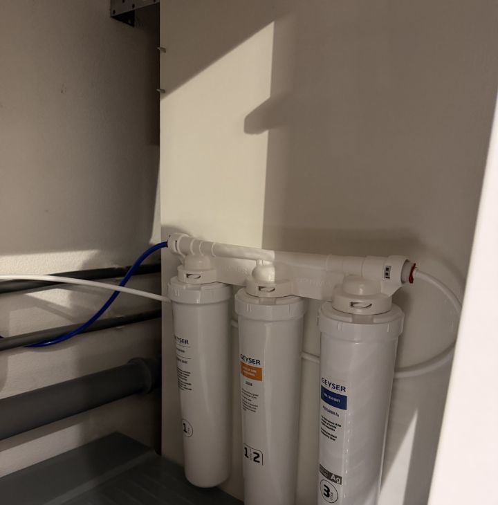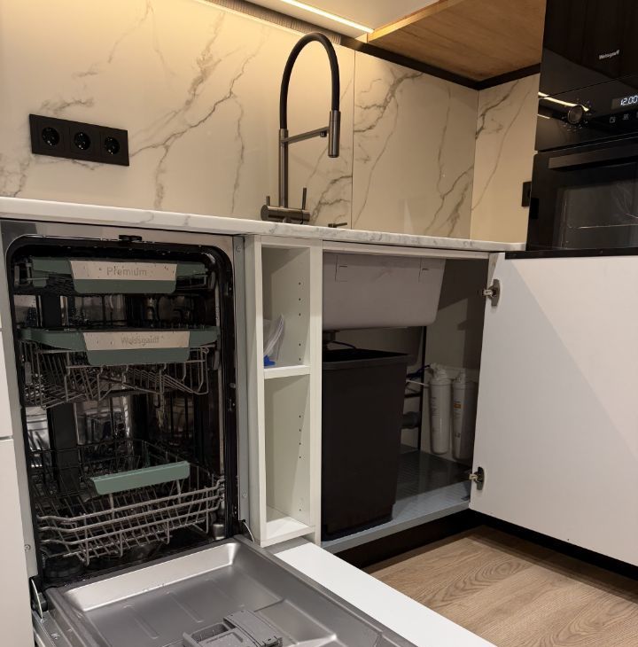 Раковина Omoikiri, плита Bosch, посудомоечная машина, духовой шкаф, микроволновая печь, холодильник, фильтр для воды.