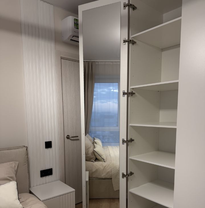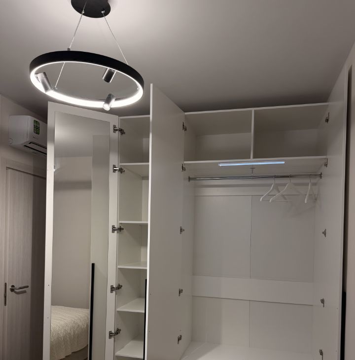 Шкаф в спальне с подсветкой и зеркалом, кровать 180 см, с подьемным механизмом. Матрас орматек