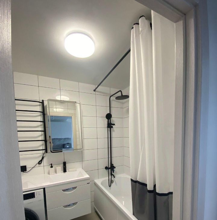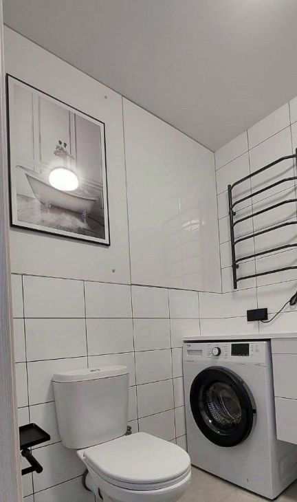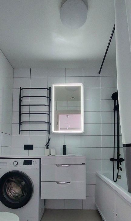 В ванной новая стиральная машинка, сушилка, шкаф для хранения в нише и зеркальный шкафчик, мойка с единой столешницей.