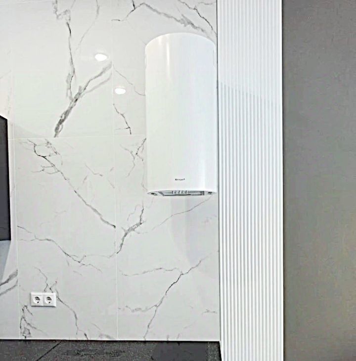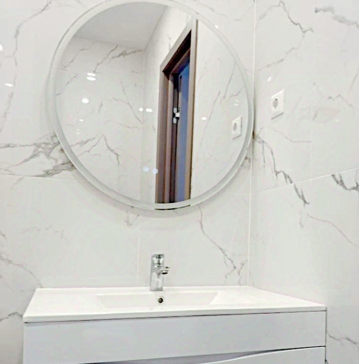 Пол в прихожей, ванной комнате и кухне-гостиной выполнен из белой мраморной плитки с системой "теплый пол"; в спальне - из качественного дорогого ламината.