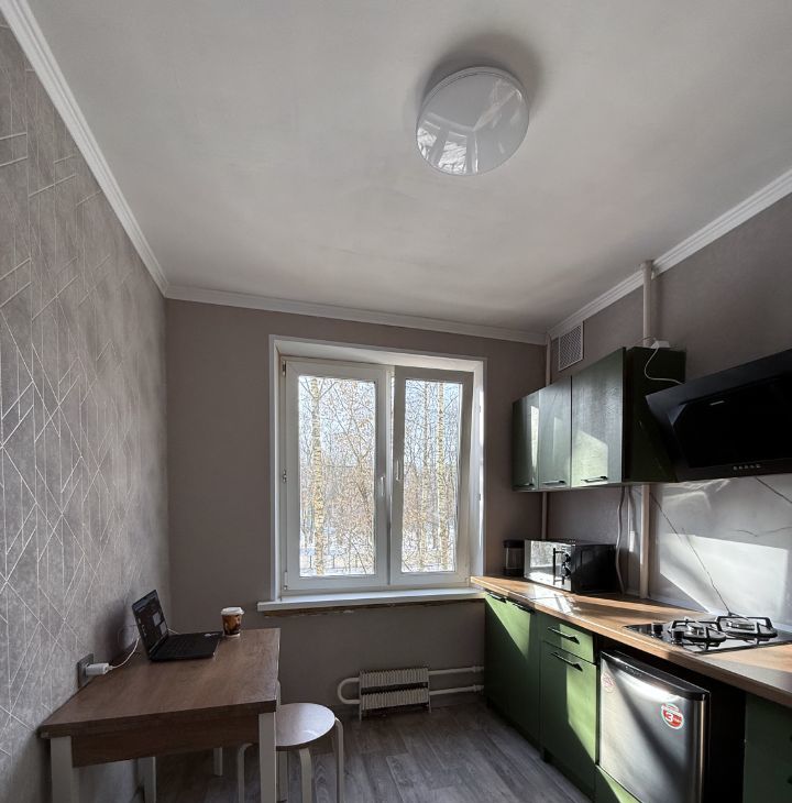 Площадь — 32 кв. м, расположена на 3-м этаже 9-этажного панельного дома. Высота потолков — 2.64 метра.