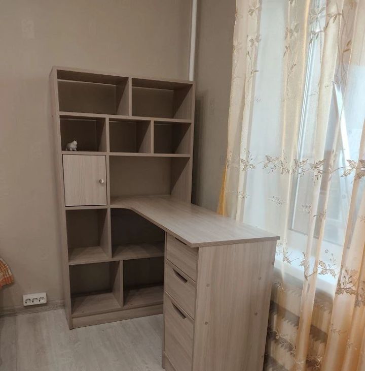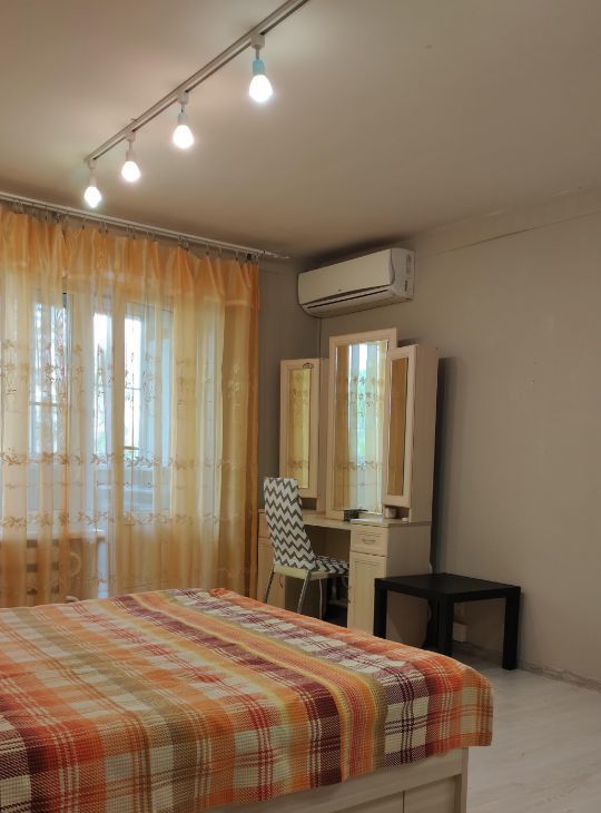 Удобная планировка с большим застекленным балконом, просторной комнатой с кондиционером, кроватью и рабочим уголком, хорошо укомплектованной кухней (посуда и прочие кухонные принадлежности).