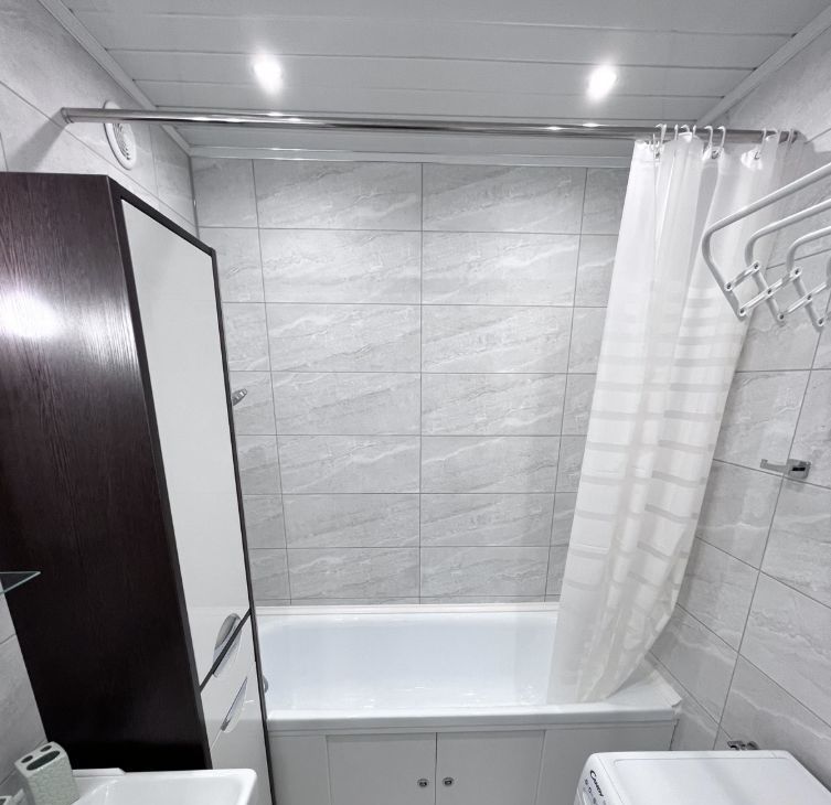 Очень светлая ванная, есть доп.подсветка у зеркала и вместительный пенал с корзиной для белья
