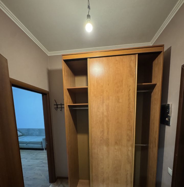 В квартире вся мебель и техника есть включая ТВ и ПММ, в комнате двуспальная кровать, диван, шкаф, ТВ, столик рабочий, на кухне из мягкой мебели диванчик. Готова к комфортному проживанию. Сан узел совмещенный евростандарт с глубокой душевой кабинкой. Лоджия застеклённая с ремонтом.