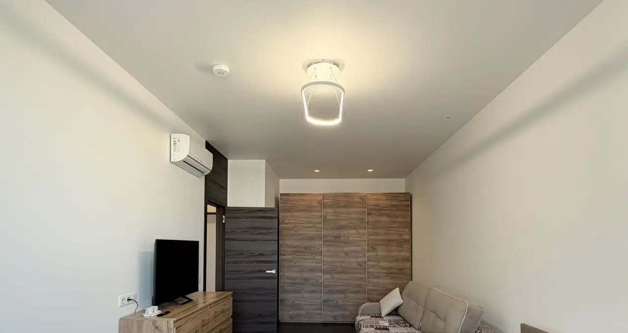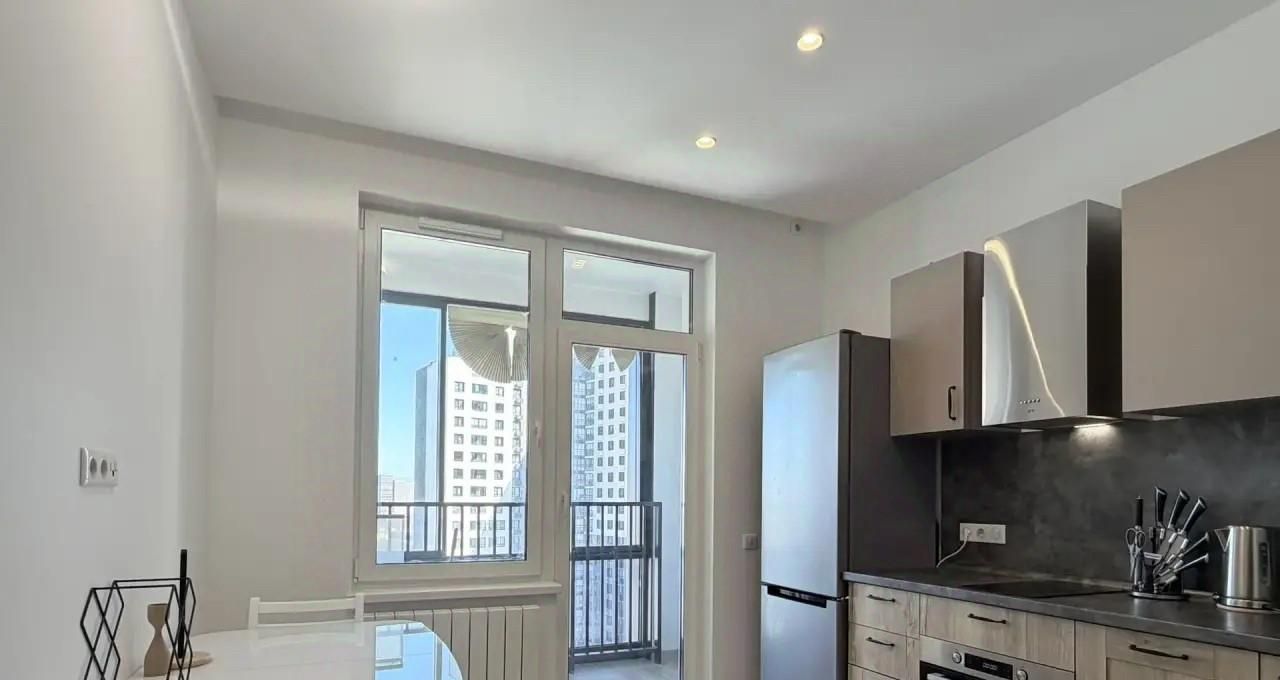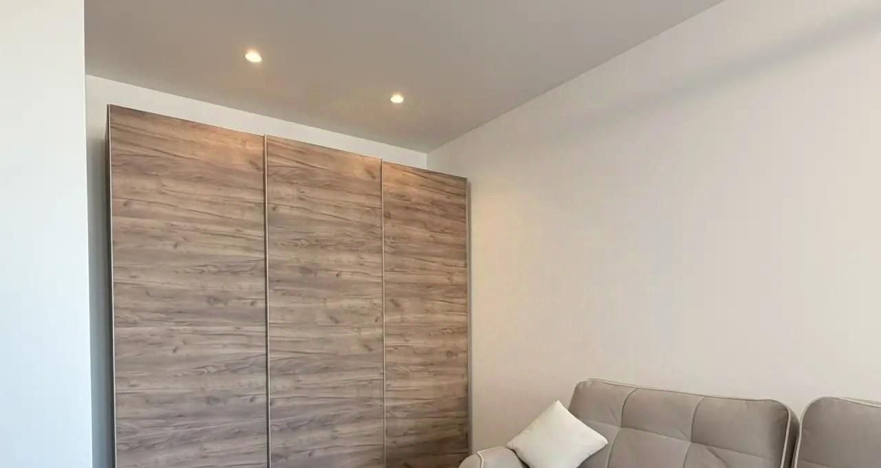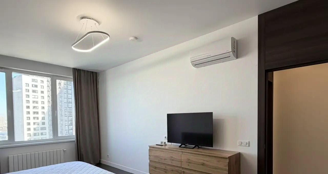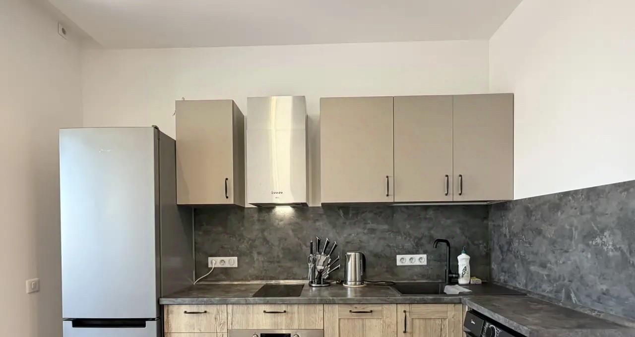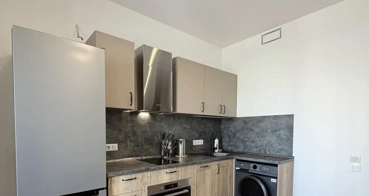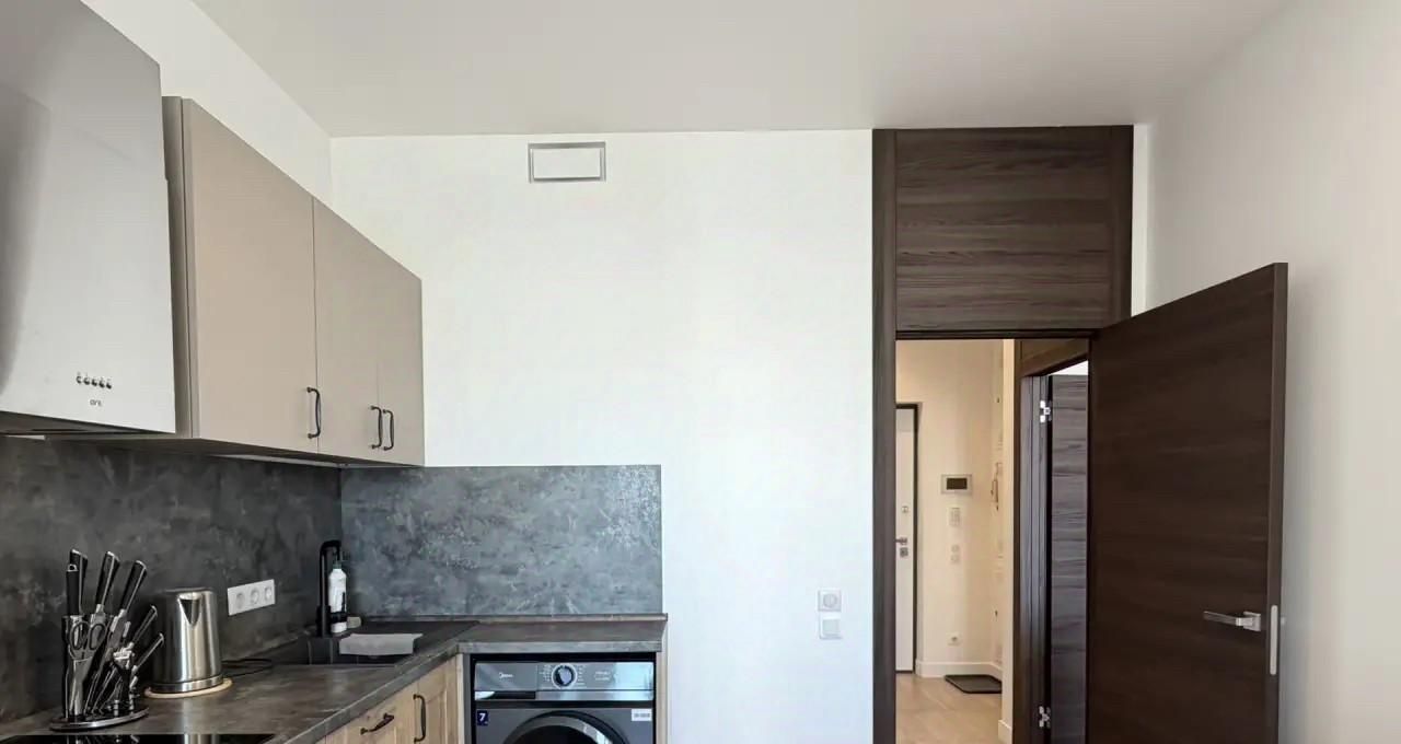 Квартира оснащена всей необходимой мебелью и бытовой техникой для комфортного проживания, включая посудомоечную машину и кондиционер.