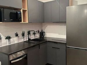 Вся мебель и техника абсолютно новые: современная кухня оснащена холодильником, духовым шкафом, посудомоечной машиной и варочной панелью.