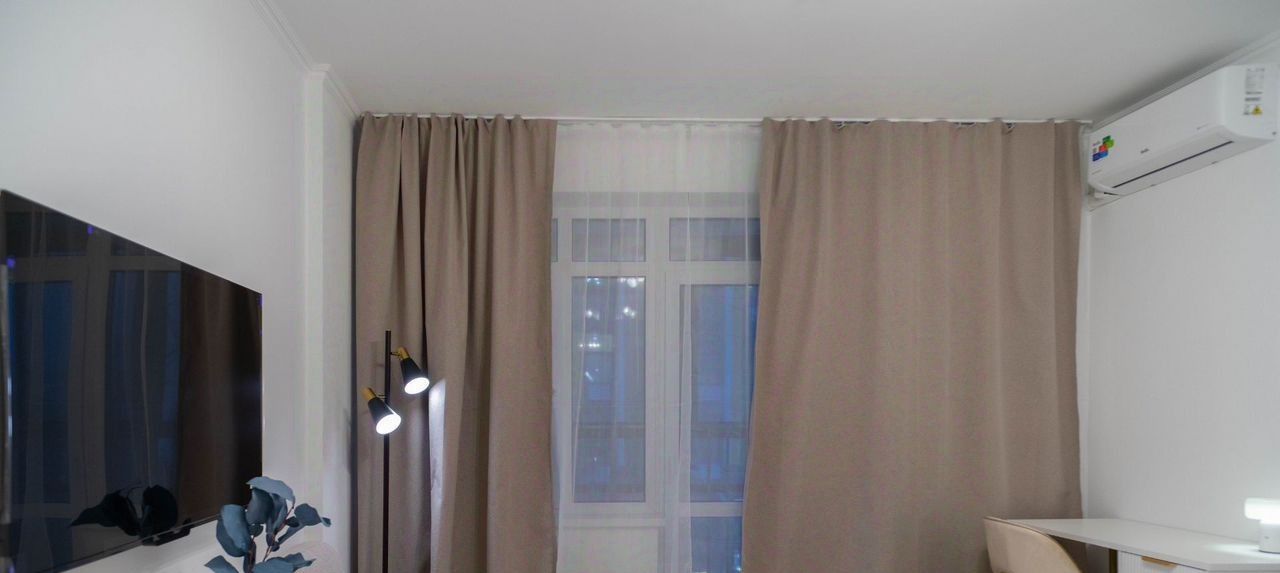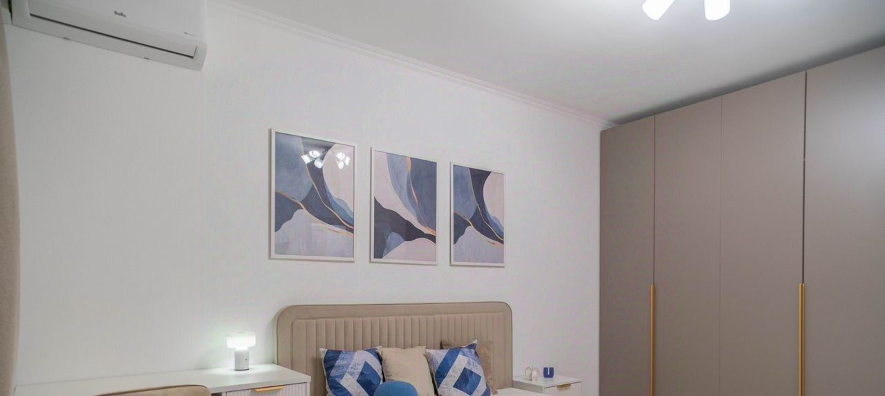 В спальне - телевизор, кондиционер, двухспальная кровать с подъемным механизмом, большой шкаф-купе, просторная лоджия, которую также можно использовать для хранения вещей.
