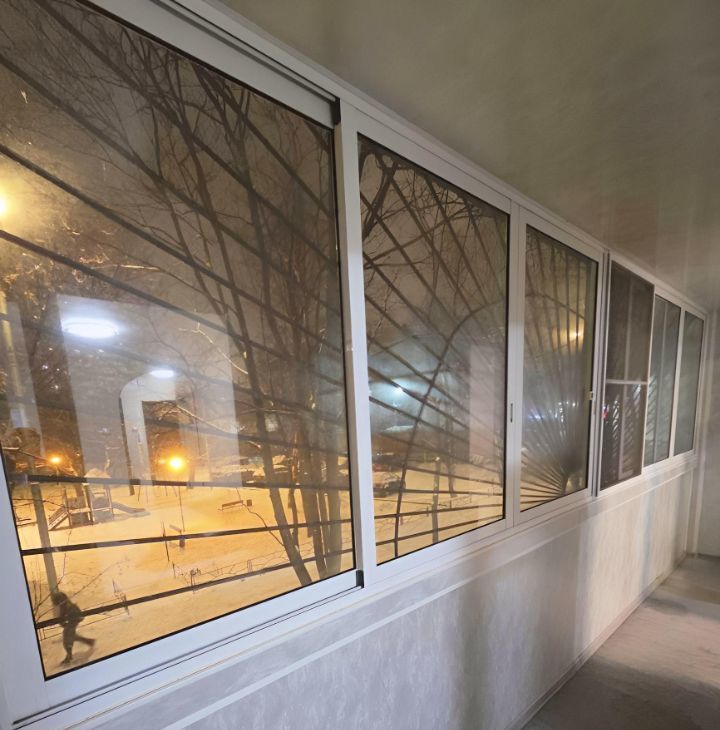 В квартире очень просторная лоджия на ширину комнаты и кухни. Окна выходят во двор.