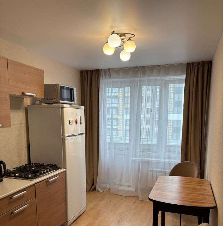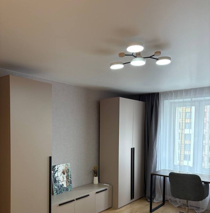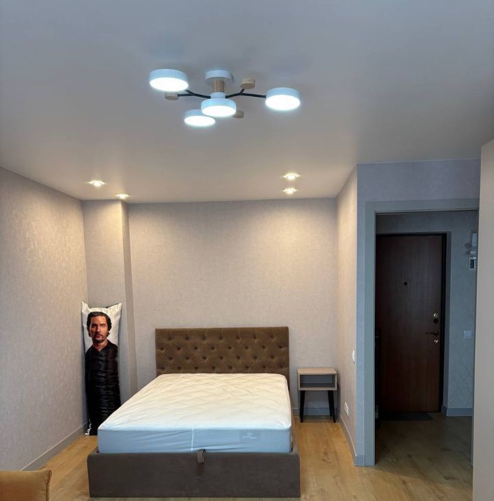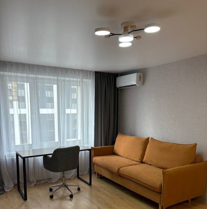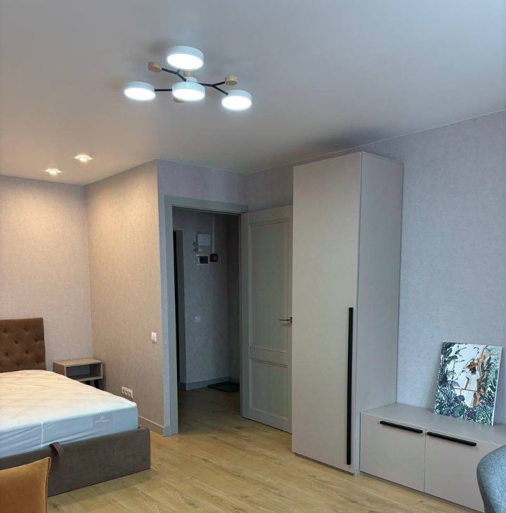 Квартира с качественным ремонтом. В комнате установлен кондиционер. Из мебели: большая двуспальная кровать с ортопедическим матрасом Askona, диван, письменный стол, модульная стенка. На кухне: встроенный кухонный гарнитур, варочная панель, холодильник, стиральная машина, микроволновая печь и обеденный стол.