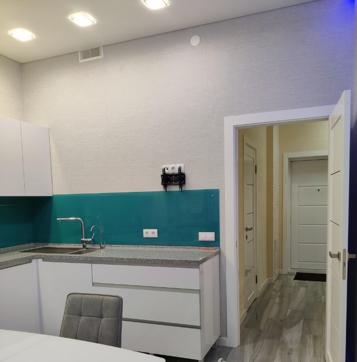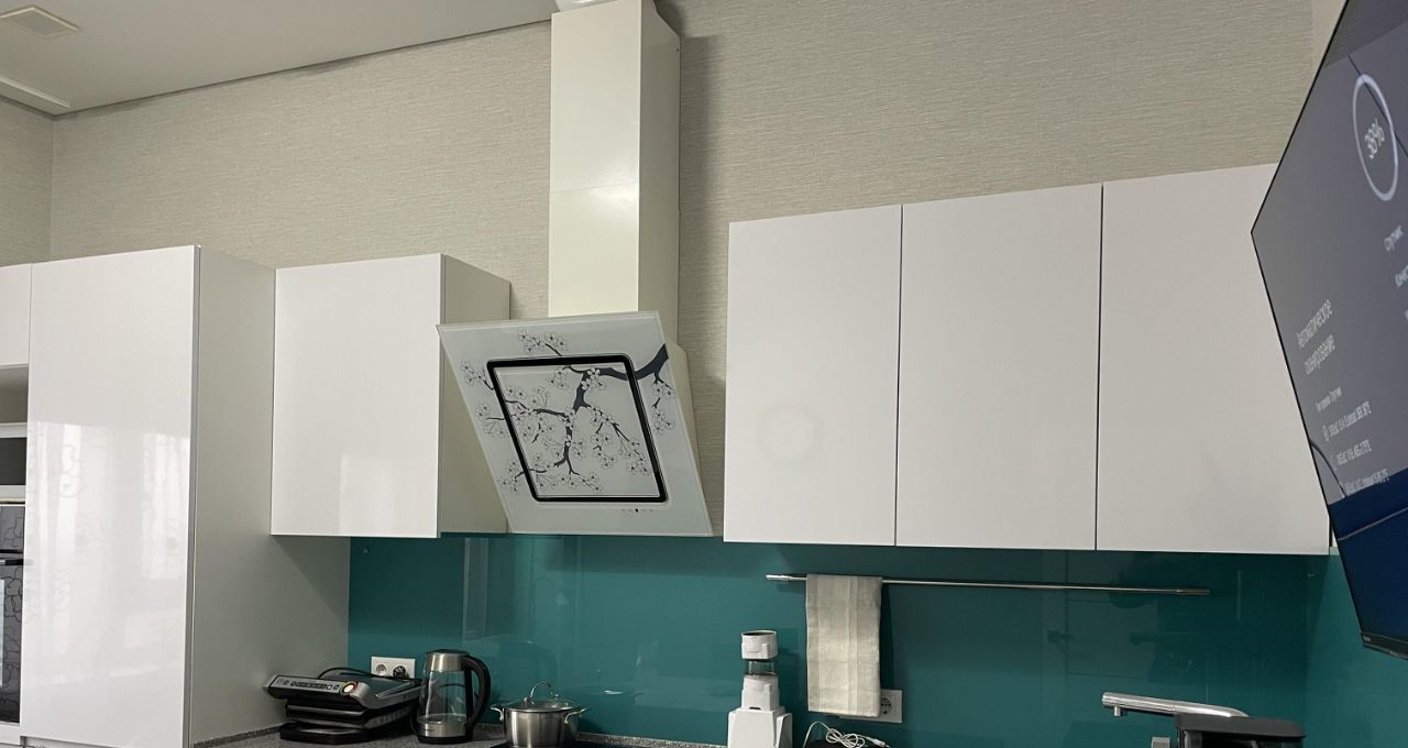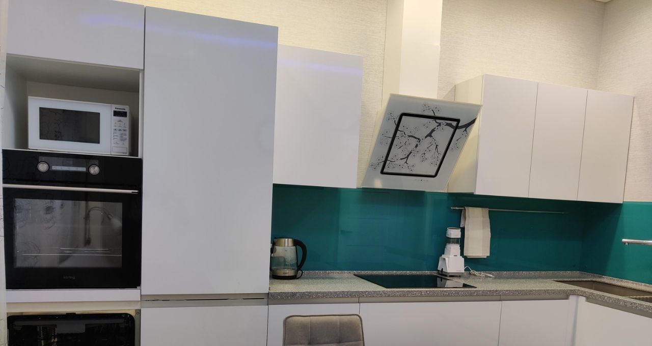 Встроенная кухня со всей бытовой техникой, в т. ч. посудомоечной машиной, электрогрилем, кофемашиной(новая), пылесосом, двумя ТВ(новые).