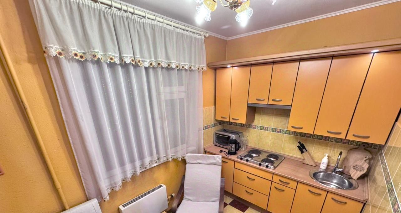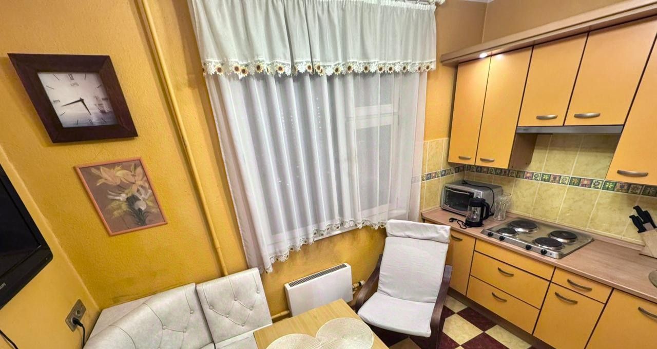 В квартире сделан дизайнерский ремонт, который подчеркивает современный стиль интерьера. Просторная комната 19м2 и оборудованная кухня оснащены всей необходимой мебелью и техникой. В наличии всё необходимое: холодильник, СВЧ, два телевизора, раскладной двухспальный диван, два раскладных кресла, шкафы, стиральная машинка, посуда, чайник