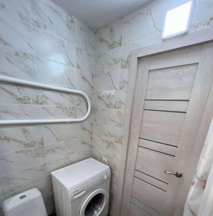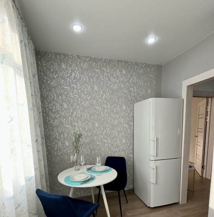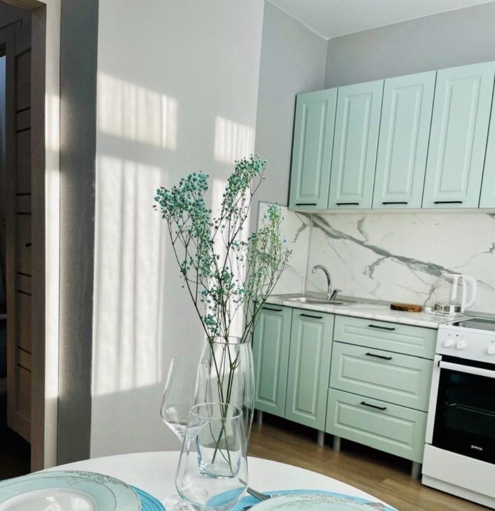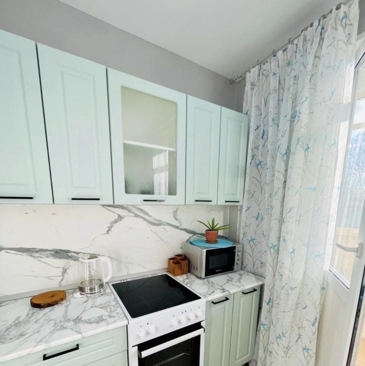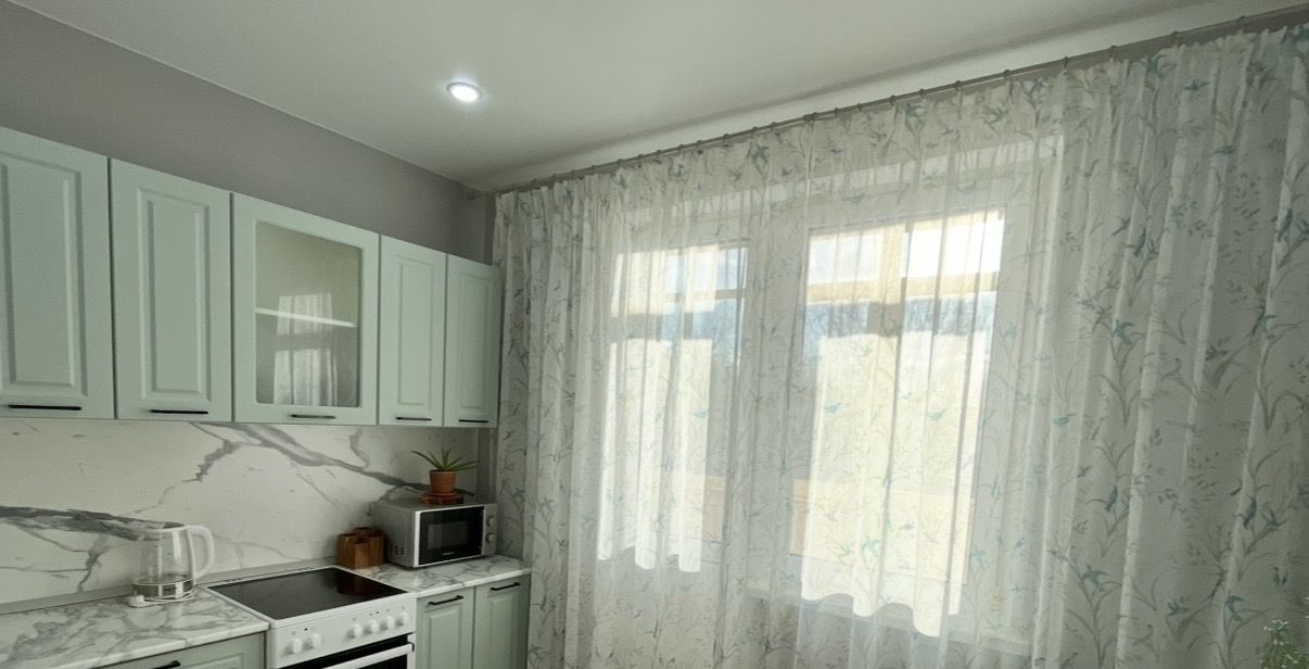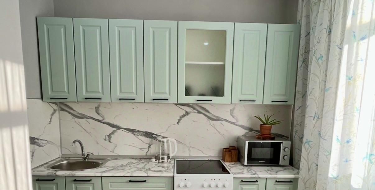 В квартире выполнен свежий косметический ремонт. Современная кухня, укомплектованная всей необходимой мебелью и бытовой техникой. Из кухни выход на застекленный балкон с красивым видом.