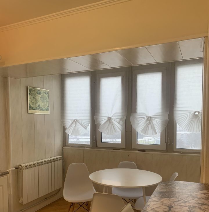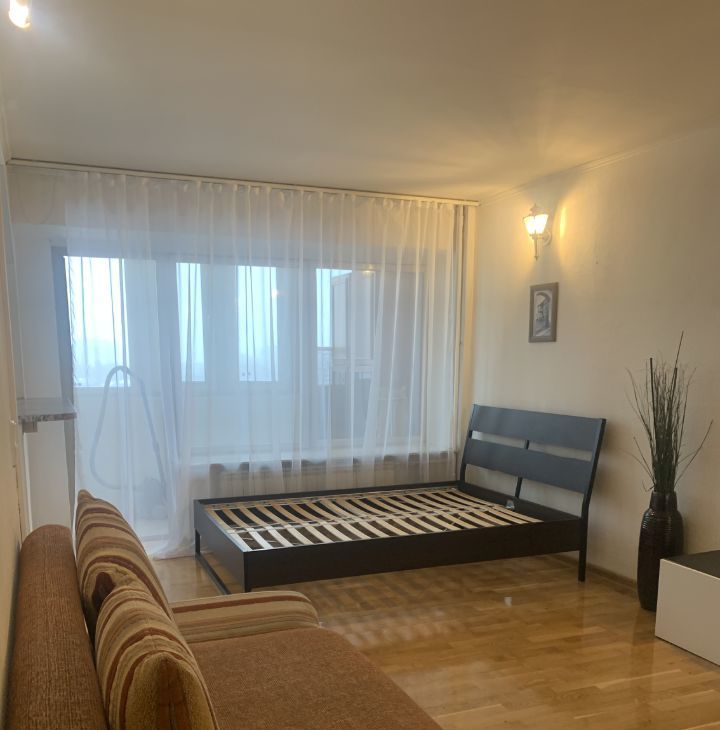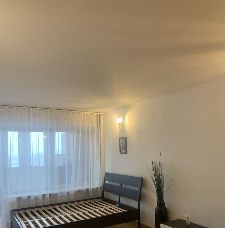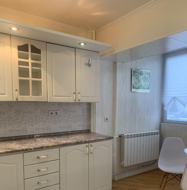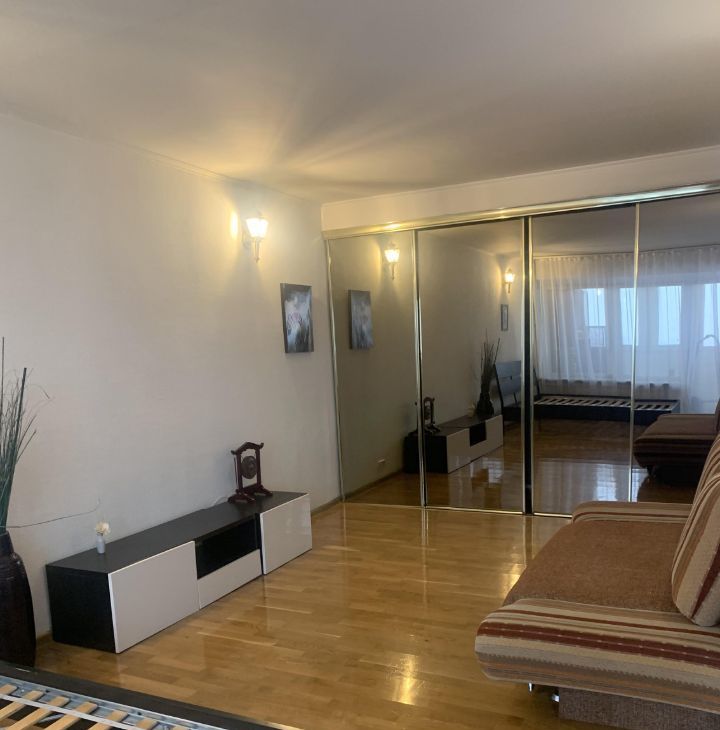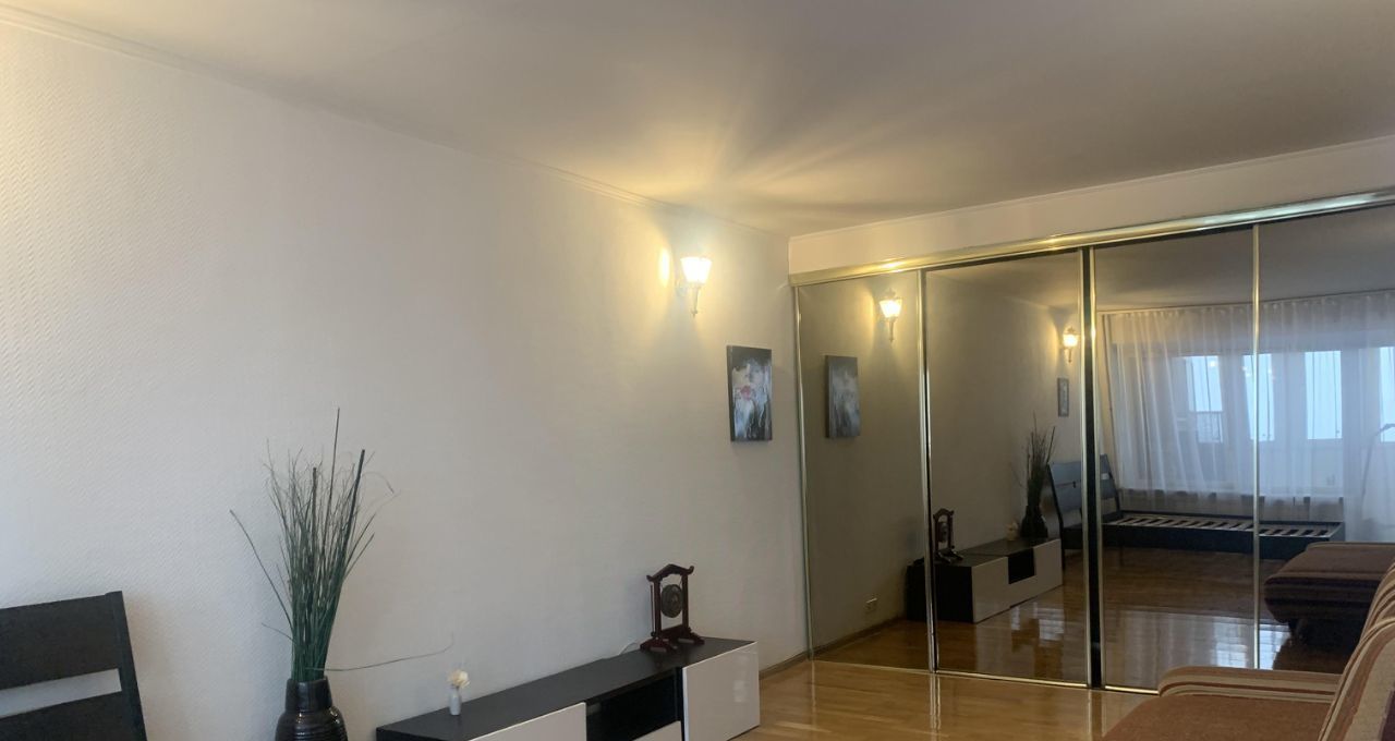 Кухня большая, кухонный гарнитур под единой столешницей, двухкамерный холодильник, варочная инфракрасная панель, кухонный стол и стулья, барная стойка. Комната с большой лоджией. Двуспальная квовать, матрас будет новый, раскладной двуспальный диван, огромный вместительный зеркальный шкаф типа Стенли. В шкафу все оборудовано современными системами хранения.