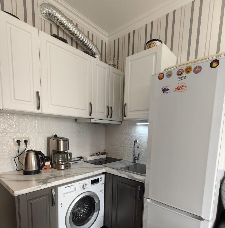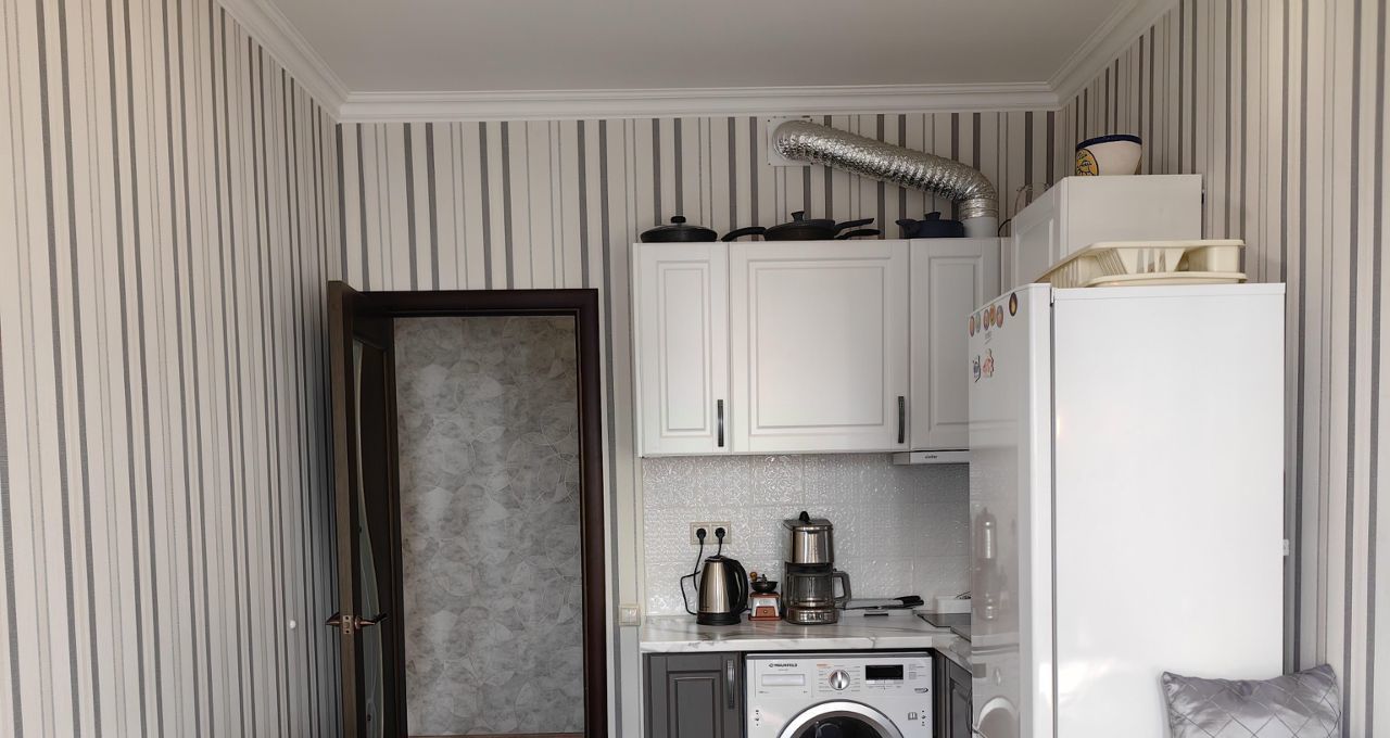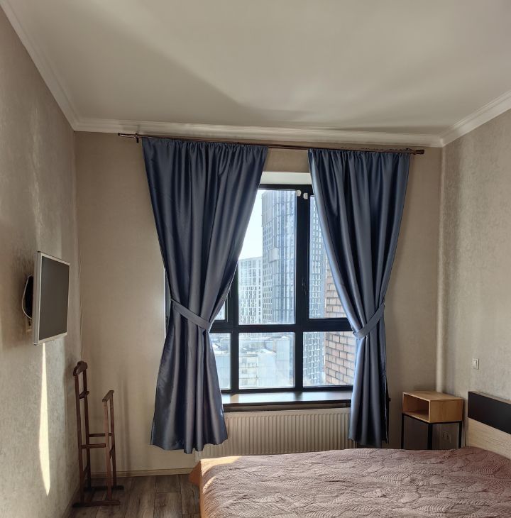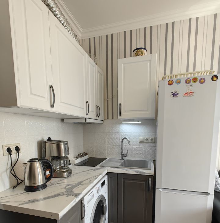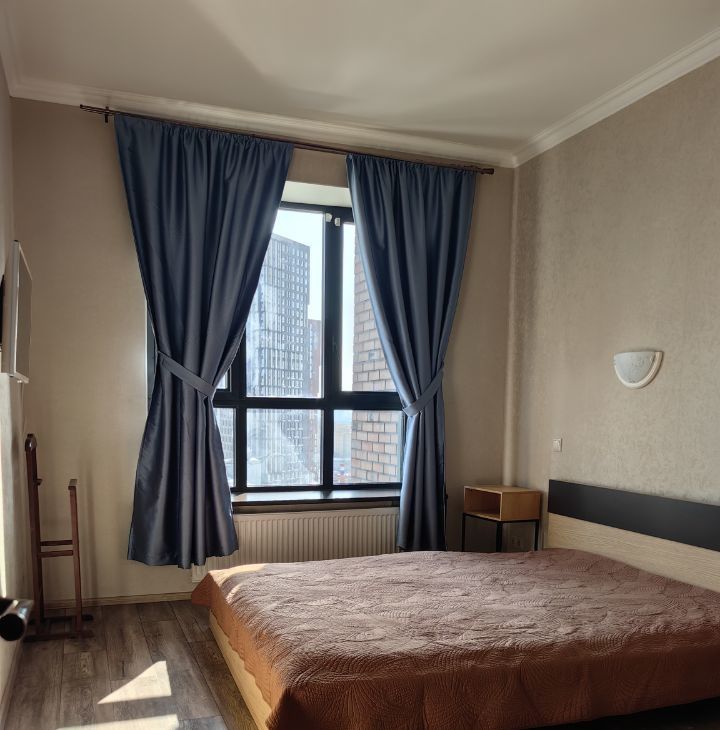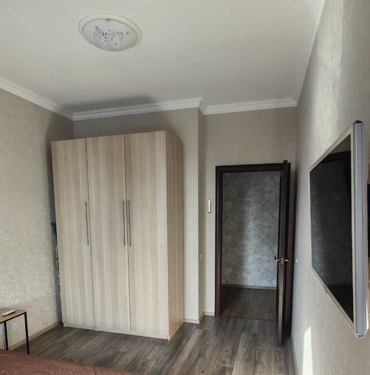 Квартира сдается оборудованная двуспальной кроватью, шкафом в комнате и коридоре, кухонный гарнитур со встроенной техникой (вытяжка, варочная поверхность, духовой шкаф), холодильник, кофемашина, диван, кухонный стол и стулья.