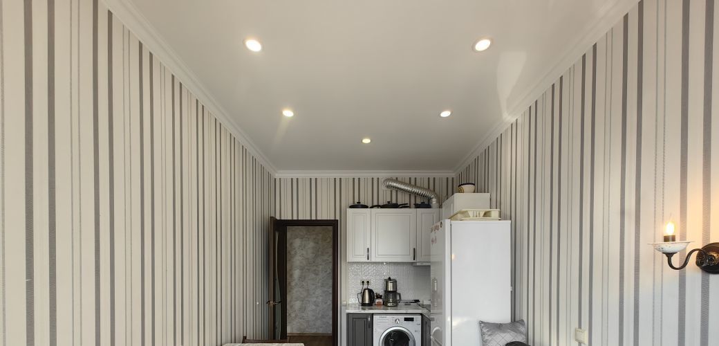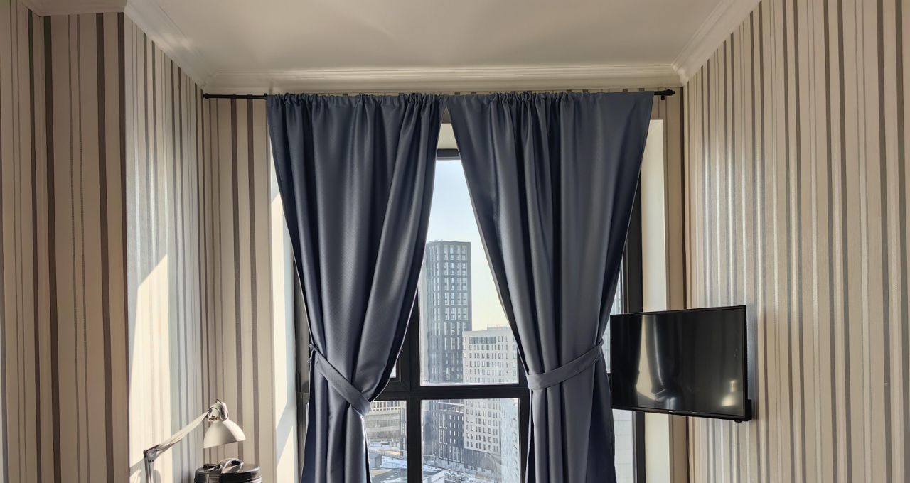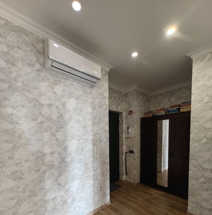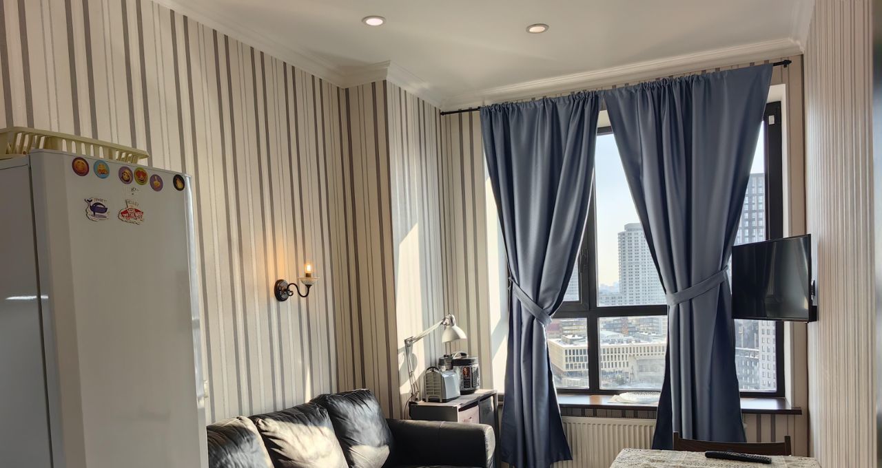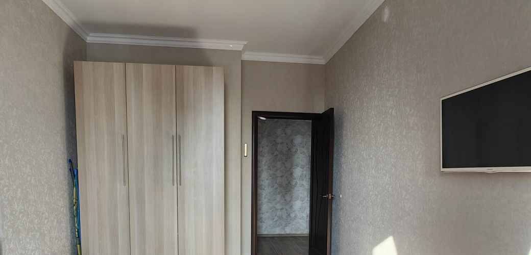 Квартира сдается оборудованная двуспальной кроватью, шкафом в комнате и коридоре, кухонный гарнитур со встроенной техникой (вытяжка, варочная поверхность, духовой шкаф), холодильник, кофемашина, диван, кухонный стол и стулья.