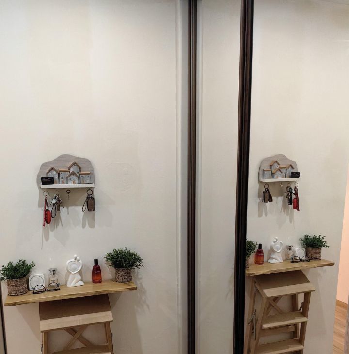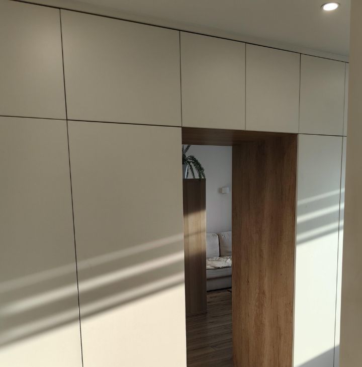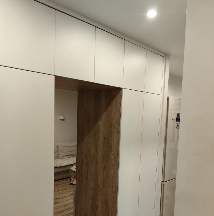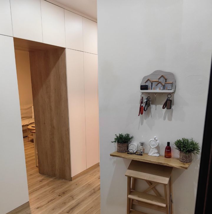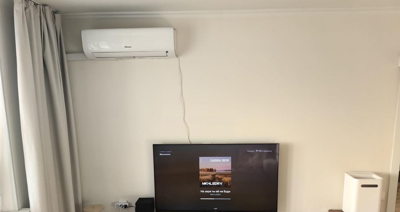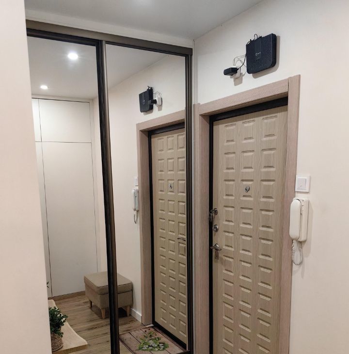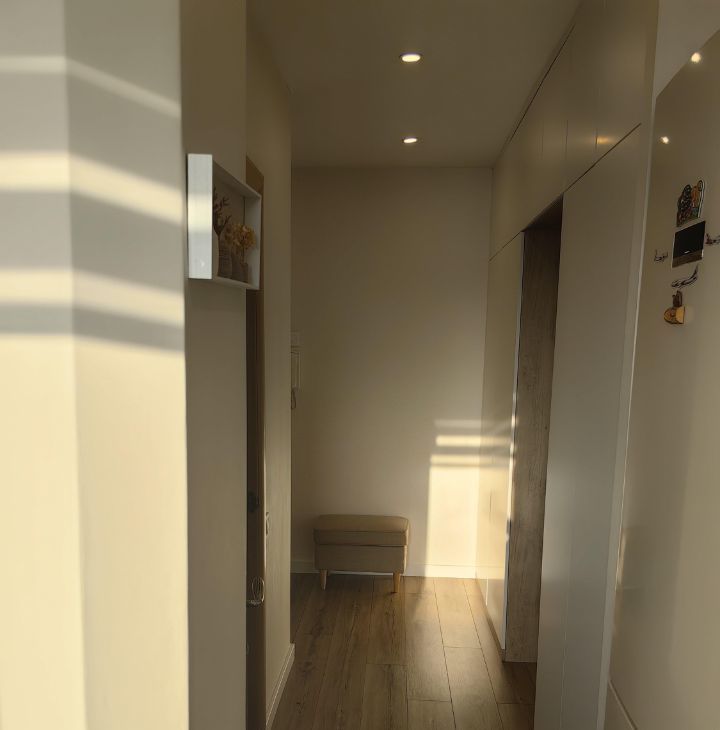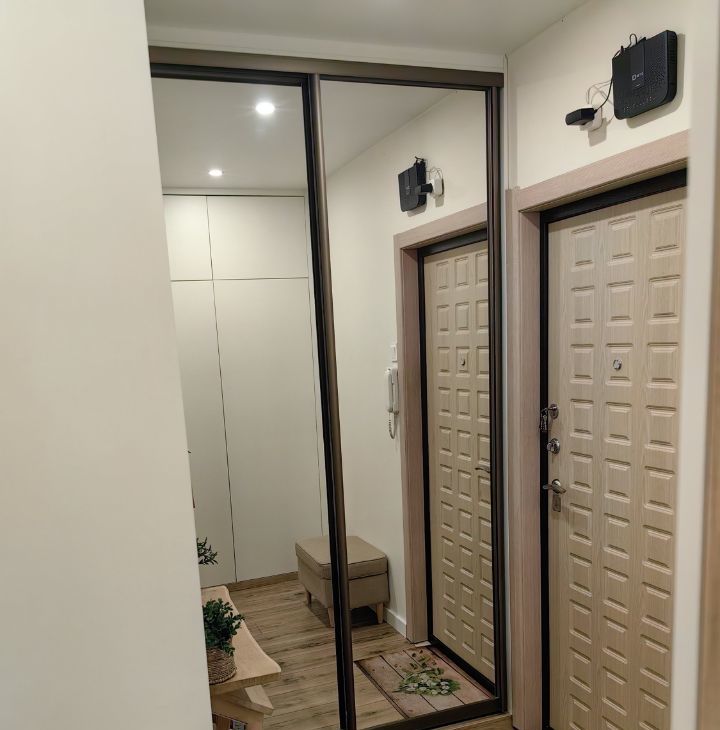 Ремонт делался под себя. Пол во всей квартире единый из ламината (33 класс villeroy boch). Коридор совмещен с кухней, использовались премиальные материалы. Под заказ сделан кухонный гарнитур с хорошей фурнитурой и встроенные шкафы в коридоре с которыми квартира и продаётся. Балкон застеклён. В комнате установлен кондиционер. Так же установлена дверь купе (Волховец).