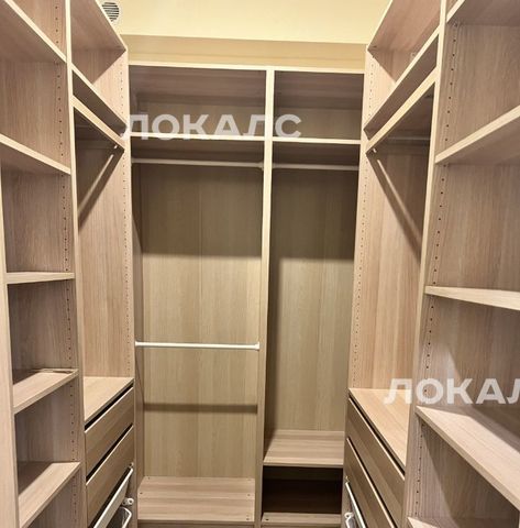 Полностью оборудованная кухня со встроенным холодильником, духовкой, микроволновкой, варочной панелью на четыре комфорки и посудомойкой. Стиральная машина в шкафу-купе с глубокими полками для хранения вещей.