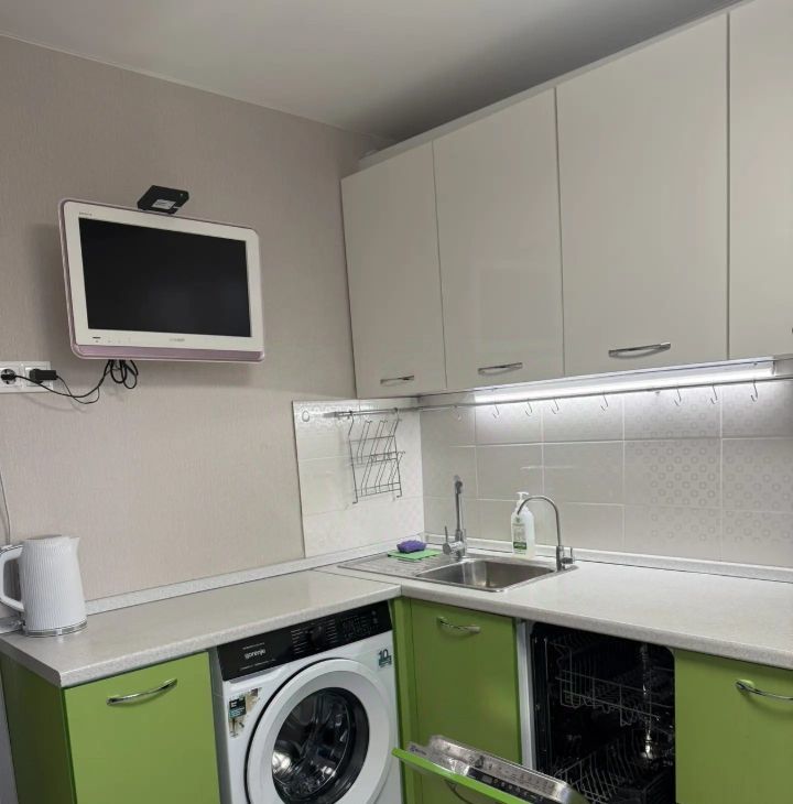 Квартира полностью оборудована всем необходимым для комфортного проживания. В кухне и комнате есть мебель(спальное место-обсуждается), осветительные приборы и современная техника(стиральная машина автомат, кондиционер, посудомоечная машина), фильтр для очистки воды.