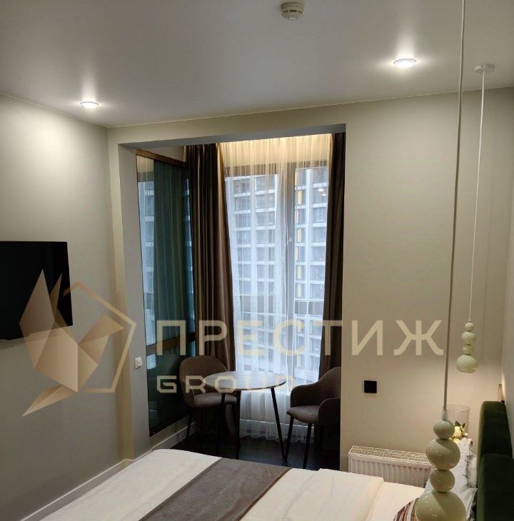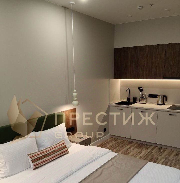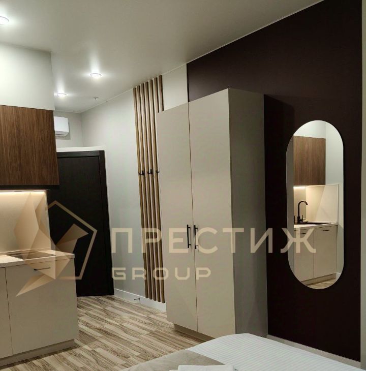 - Единое помещение с кондиционером, двуспальной кроватью, зоной кухни, зоной отдыха с журнальным столиком и креслами.