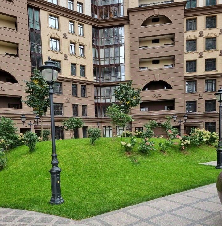 Благоустроенная дворовая территория, в которой имеется различные зеленные насаждения, детские и спортивные площадки, 2 фонтана, амфитеатр. Дворовая территория закрыта от посторонних и машин, что делает двор безопасным и комфортным.