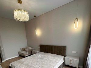 В зоне кухни-гостиной - кухонный гарнитур со столовой группой, изготовленный по индивидуальному проекту; полный спектр бытовой техники (индукционная варочная панель, холодильник, микроволновка, встроенные духовка и посудомойка). Диван-трансформер удобно расположен напротив широкоформатного смарт ТВ. Продумано несколько разных сценариев освещения для любых пожеланий.