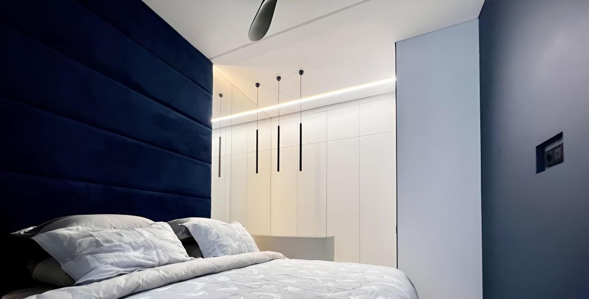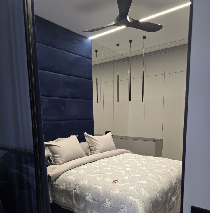 В спальне большая зона для гардероба, туалетный или рабочий столик, большая кровать с подьемным механизмом, матрас "Орматек", на потолке вентилятор.