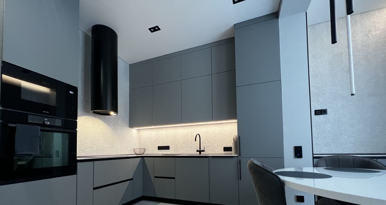 На кухне, просторная зона готовки, современный кухонный гарнитур, встроенный духовой шкаф, микроволновая печь, индукционная варочная плита, вытяжка, тостер, чайник, кофе машина, холодильник, фильтр для питевой воды, посудомойка, все фирмы "Gorenje". Вся посуда так же в наличии. Раздвижной круглый стол в обеденной зоне.