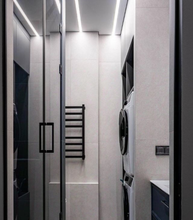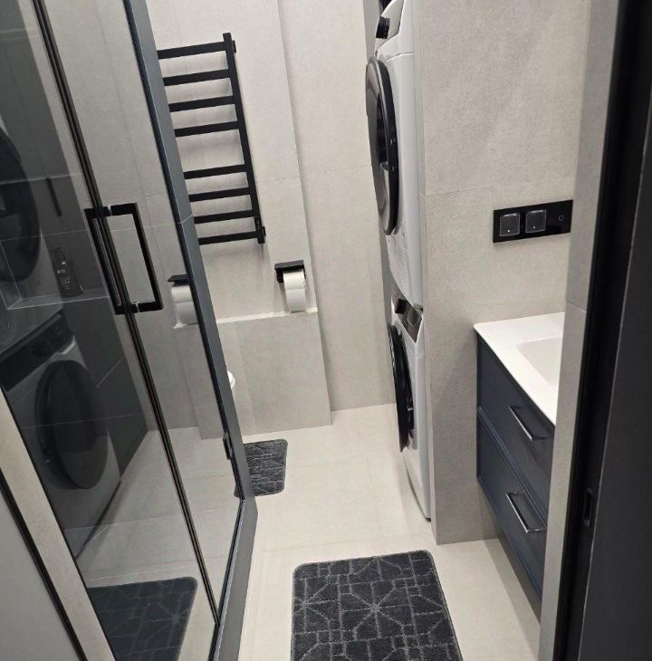 Просторная душевая, сушильная и стиральная машина.