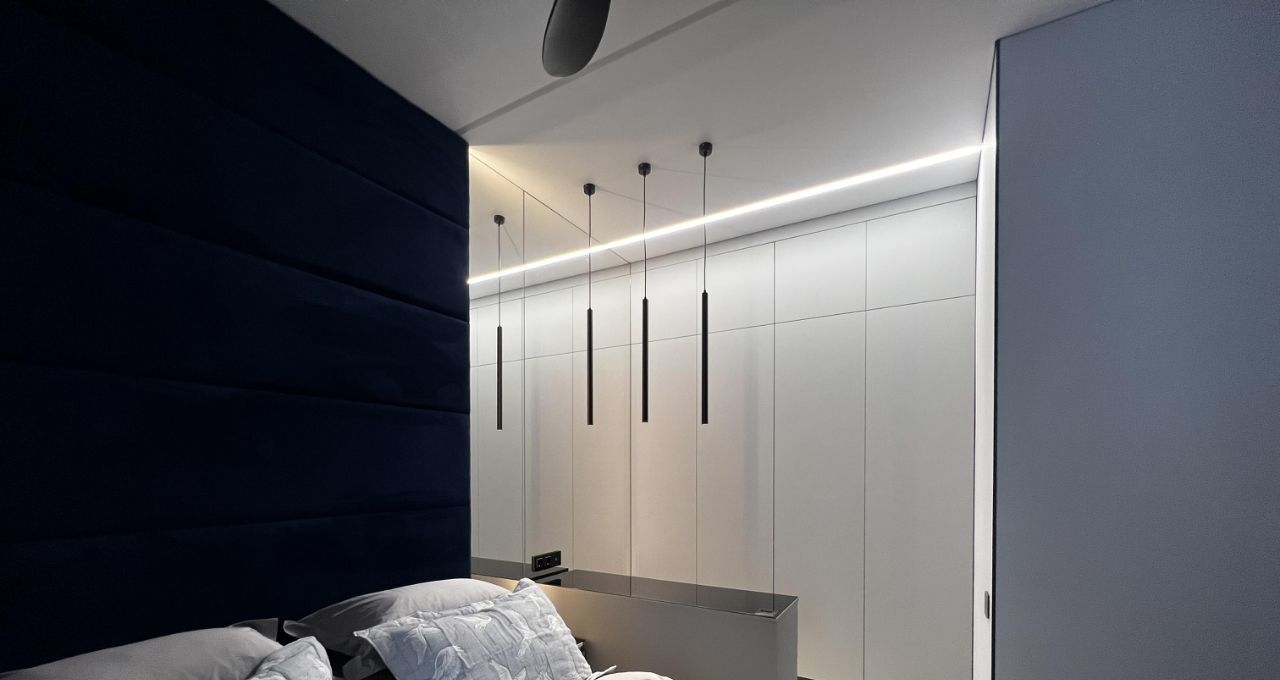 В спальне большая зона для гардероба, туалетный или рабочий столик, большая кровать с подьемным механизмом, матрас "Орматек", на потолке вентилятор.