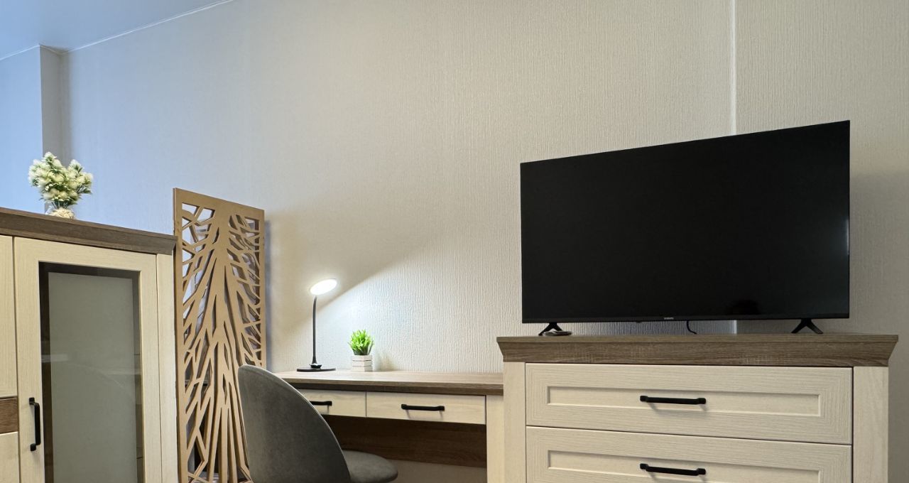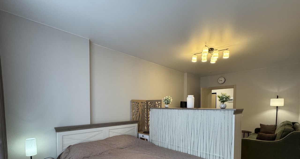 - квартира полностью меблирована, просторная комната разделена на две зоны, гостиную и спальную.