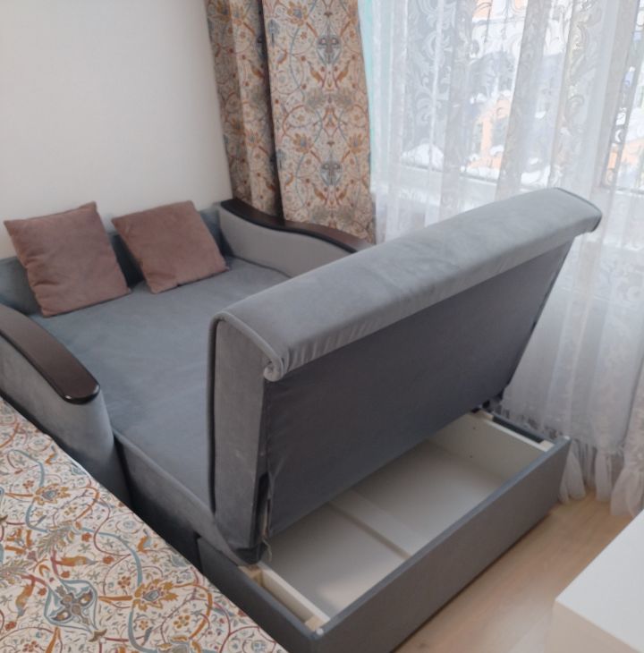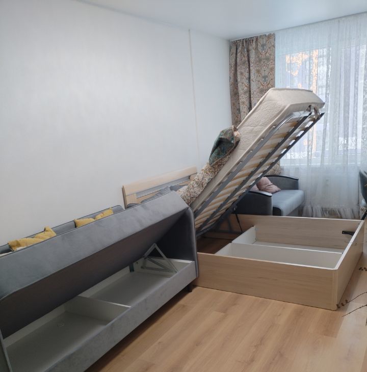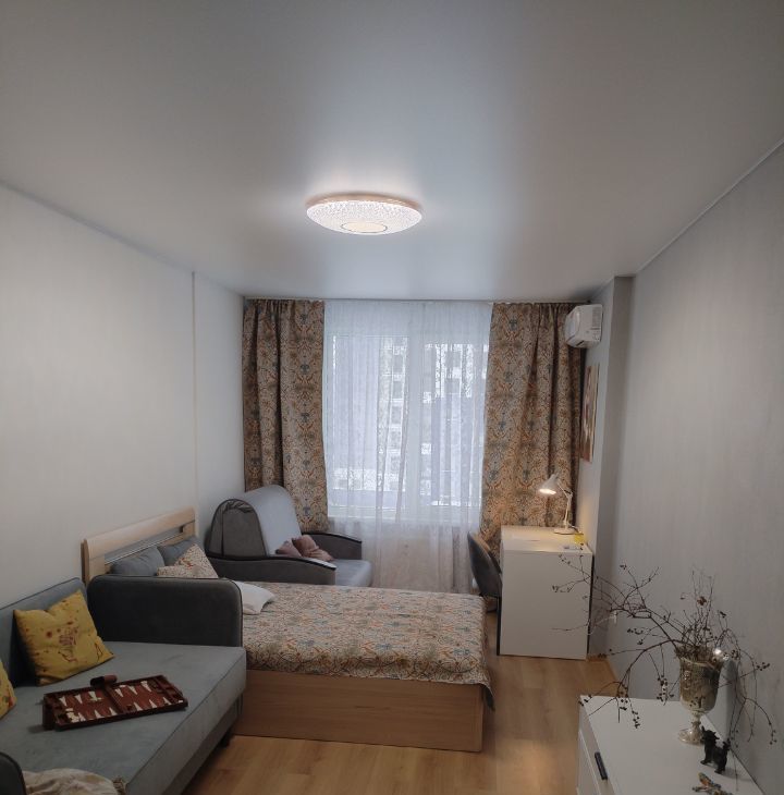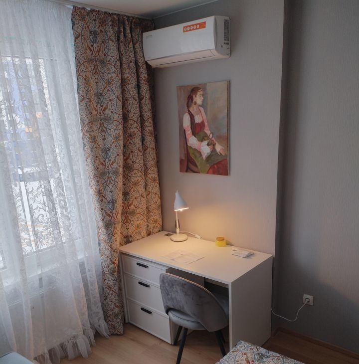 Мебель двуспальная кровать 160*200 с матрасом, софа, раскладной диванчик(изготовлен на заказ под размеры балкона) рабочий стол, с тумбой на 3 выдвижными ящиками, двухсекционный платяной шкаф, тумба под тв. (два выдвижных двухсекционных ящиков).Кондиционер. Гобеленовые шторы,тюль, покрывало.