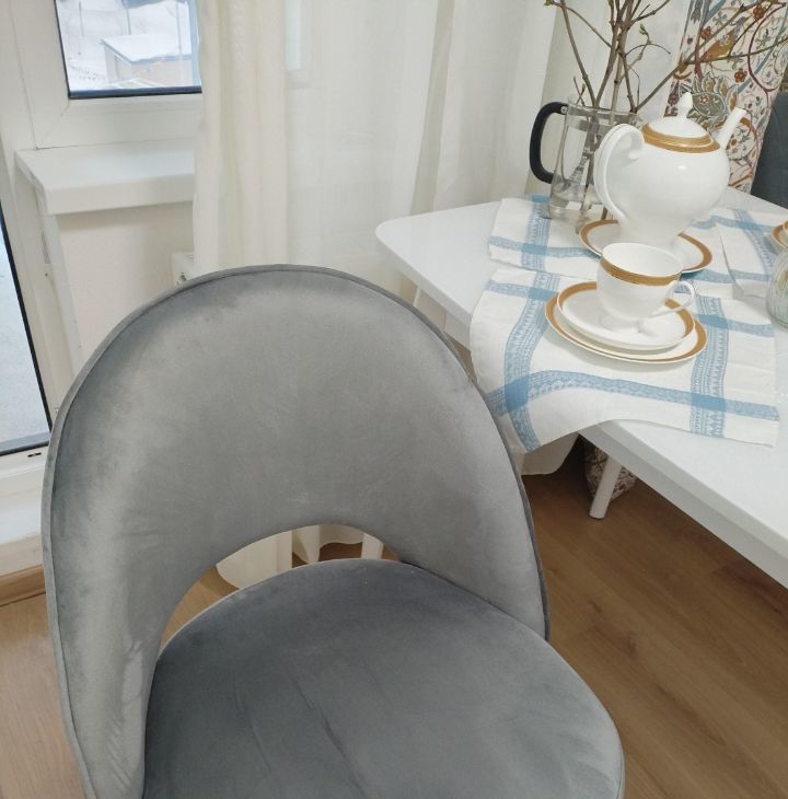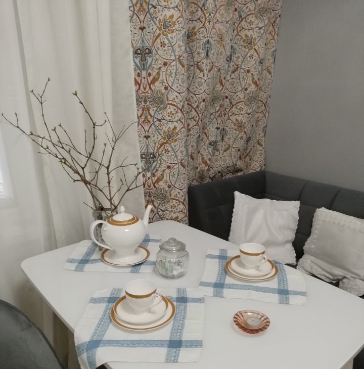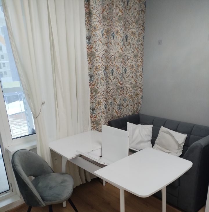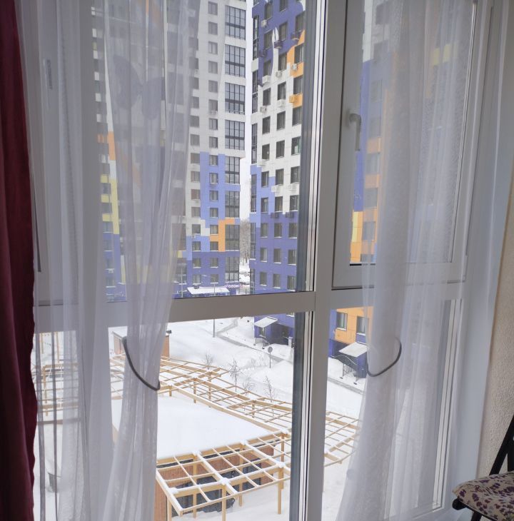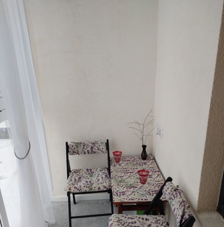 Балкон:с остеклением от пола до потолка (профессиональная установка теплового контура, заменили остекление от застройщика) — дополнительное пространство для отдыха и спорта или хранения.Профессиональное остекление, сохраняющее тепло превращает балкон в жилое помещение(кабинет.На балконе помещается раскладной диванчик из жилой комнаты.), журнальный столик , 2 стула. Темные шторы,тюль, подхваты.