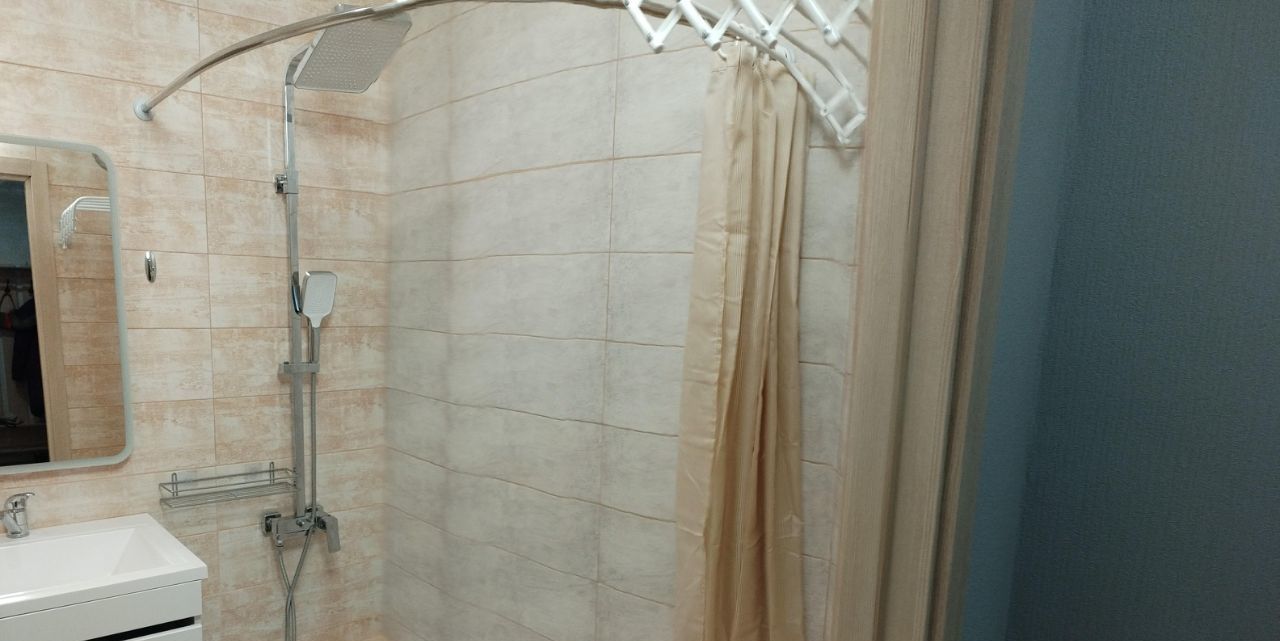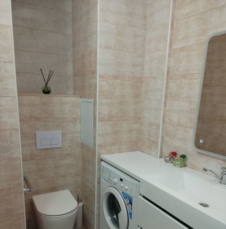 Ванная комната инсталляция вместо унитаза, душевой поддон, тропический душ на 2 лейки, , раковина тумбой с 2 выдвижными ящиками под общей столешницей, стиральная машинка. Зеркало с регулируемой подсветкой. Навесная сушилка для белья.